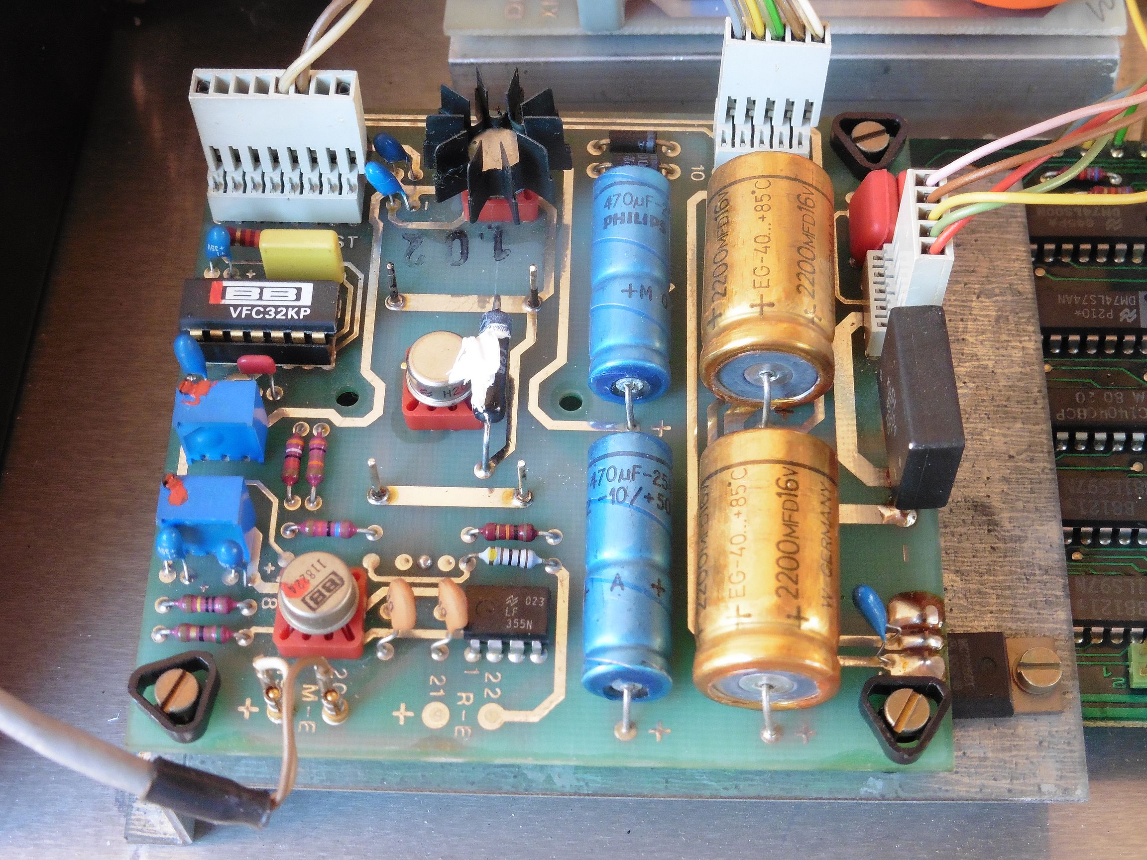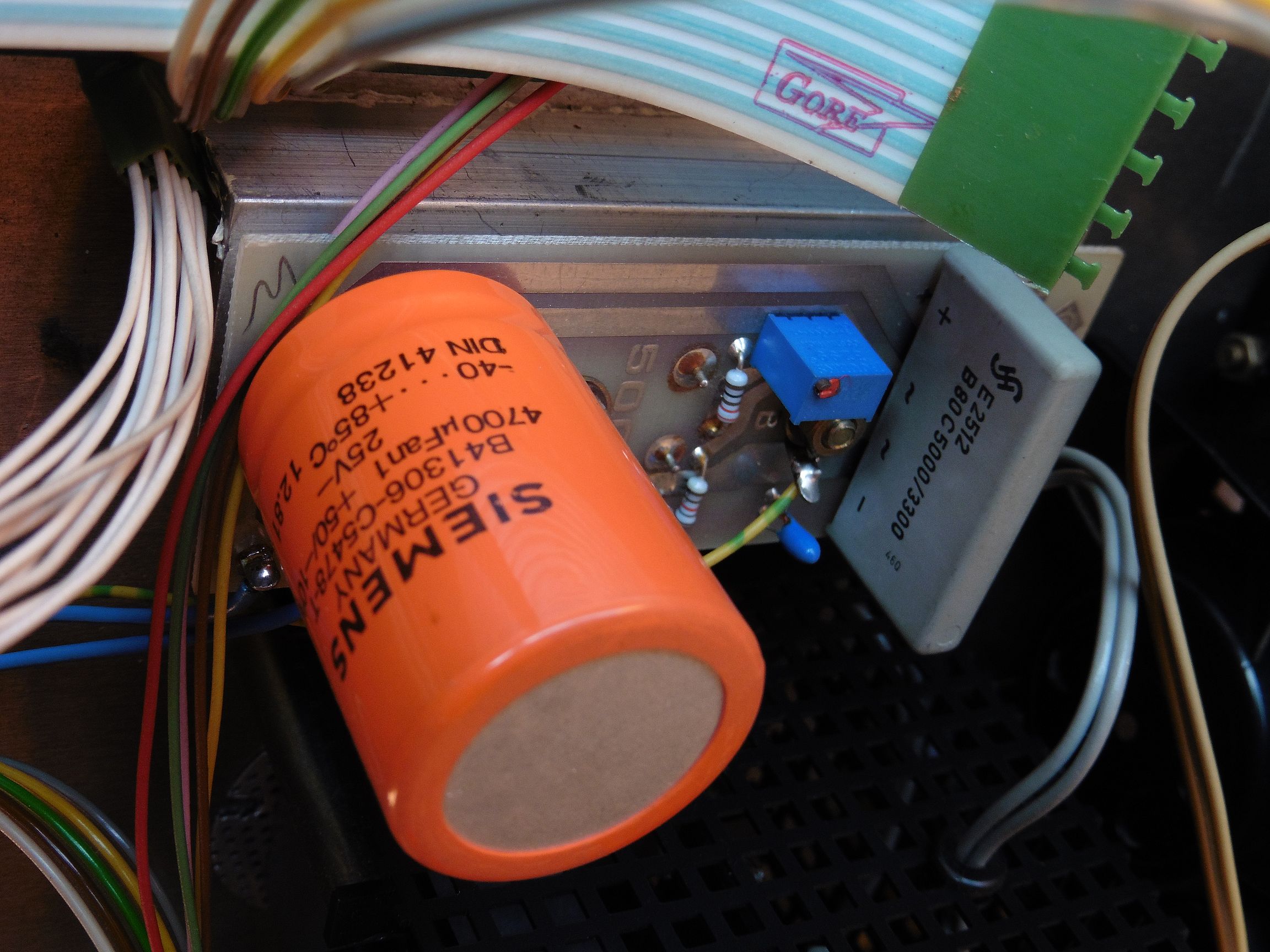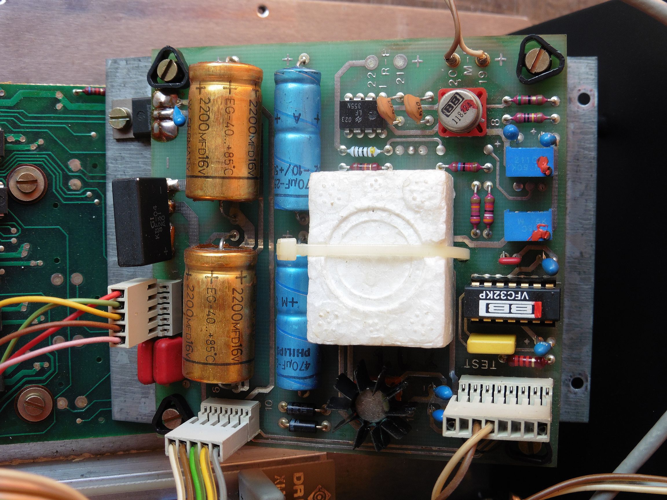 Pregaranje osigurača nakon 2 minuta najviše ukazuje na to da su loši filtarski elektrolitski kondenzatori napajanja. I na ovom mojem primjerku ti kondenzatori vizualno ne izgledaju baš najbolje (zlatne boje 2200 uF i pored njih plavi 470 uF). Uobičajeno da se elektrolitski kondenzatori s vremenom (kroz desetljeća) osuše i više se ne ponašaju kao kondenzatori nego kao otpornici (griju se i vuku previše struje pa stoga vjerojatno i pregara osigurač). Ako želite aktivno koristiti ovaj uređaj za rad trebalo bi zamijeniti sve elektrolitske kondenzatore.