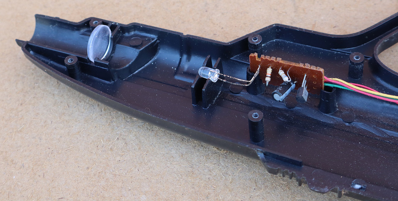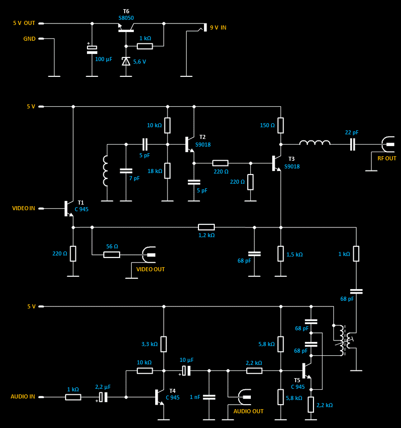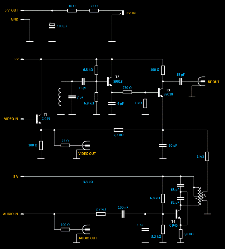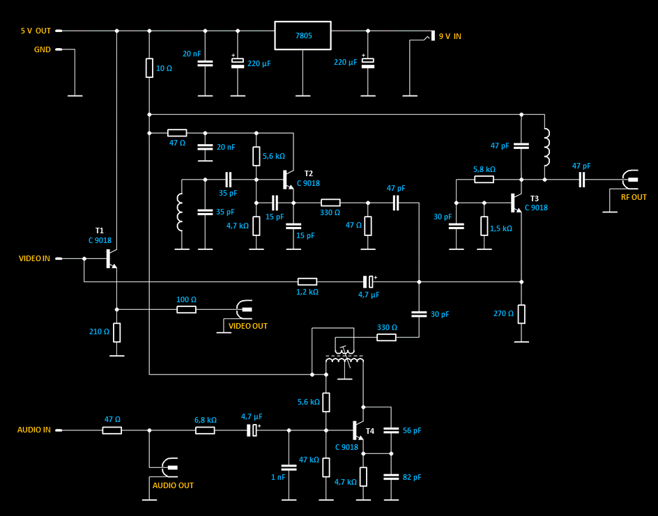 Za video signal je ugrađeno pojačalo za odvajanje (emitersko slijedilo) sa tranzistorom T1 preko kojeg se dobiva video-kompozitni izlaz. Istim video signalom se također amplitudno modulira oscilator/mješač sa tranzistorima T2/T3. Ako pogledamo oscilator sa T2 koji mora raditi na TV kanalnoj frekvenciji nosioca slike, vidimo da se titrajni krug nalazi u krugu baze tranzistora. Međutim, nigdje jasno ne vidimo pozitivnu povratnu spregu sa emitera ili kolektora tranzistora kojim se podržavaju oscilacije. S obzirom da je signal u fazi na emiteru tranzistora, onda se ovdje vrlo vjerojatno koristi interni parazitski kapacitet spoja emiter-baza preko kojeg se podržavaju oscilacije. Dovoljan je mali interni kapacitet (nekoliko pF) za povratni prolaz dijela VF oscilacija. Miješanje oba nosioca je na emiteru T3. Na RF izlazu je ugrađen serijski LC rezonantni filtar proračunat za noseće (kanalne) frekvencije. Ovime je svakako smanjen prodor RF signala na susjedne TV kanale.