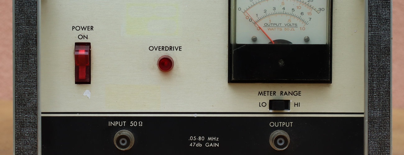 Prednja ploča sa kontrolama je jednostavna i kao što vidimo nema potrebe za preklapanjem frekvencijskih opsega. Ugrađena je automatska zaštita od ulaznog ili izlaznog preopterećenja (OVERDRIVE). Zaštita isključuje ako je ulazni signal veći od 3 V RMS i ako je izlazna priključnica bez opterećenja ili kratko spojena. Ugrađeni mjerni instrument mjeri izlazni napon i snagu (50 Ω) u dva mjerna opsega: