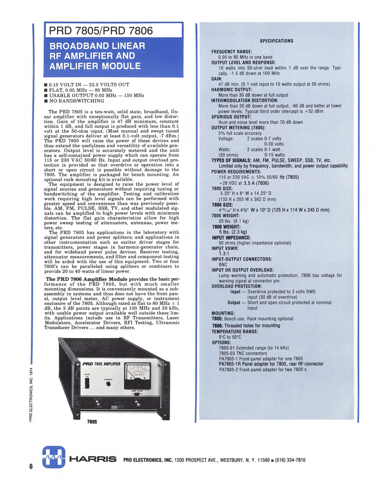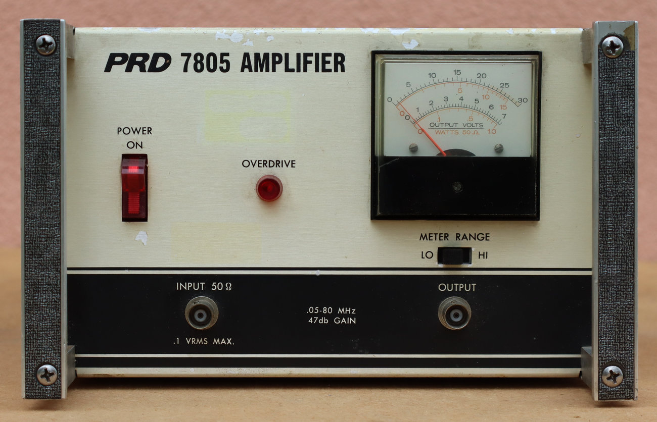 RF pojačalo PRD 7805 radi linearno (±1 dB) u frekvencijskom opsegu 0,05 – 80 MHz. Izlazna snaga je 10 W (na opterećenju 50 Ω) i ona se postiže već kod ulaznog signala amplitude 100 mV. Time je pojačanje minimalno 47 dB. Pojačalo se može koristiti i za više frekvencije naravno uz postepeni pad pojačanja (-1,5 dB na 100 MHz). Potiskivanje harmonika i intermodulacijskih izobličenja je bolje od 30 dB na punoj snazi od 10 W, a razina vlastitog šuma je ispod -70 dB.