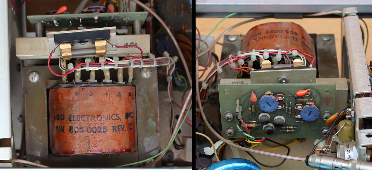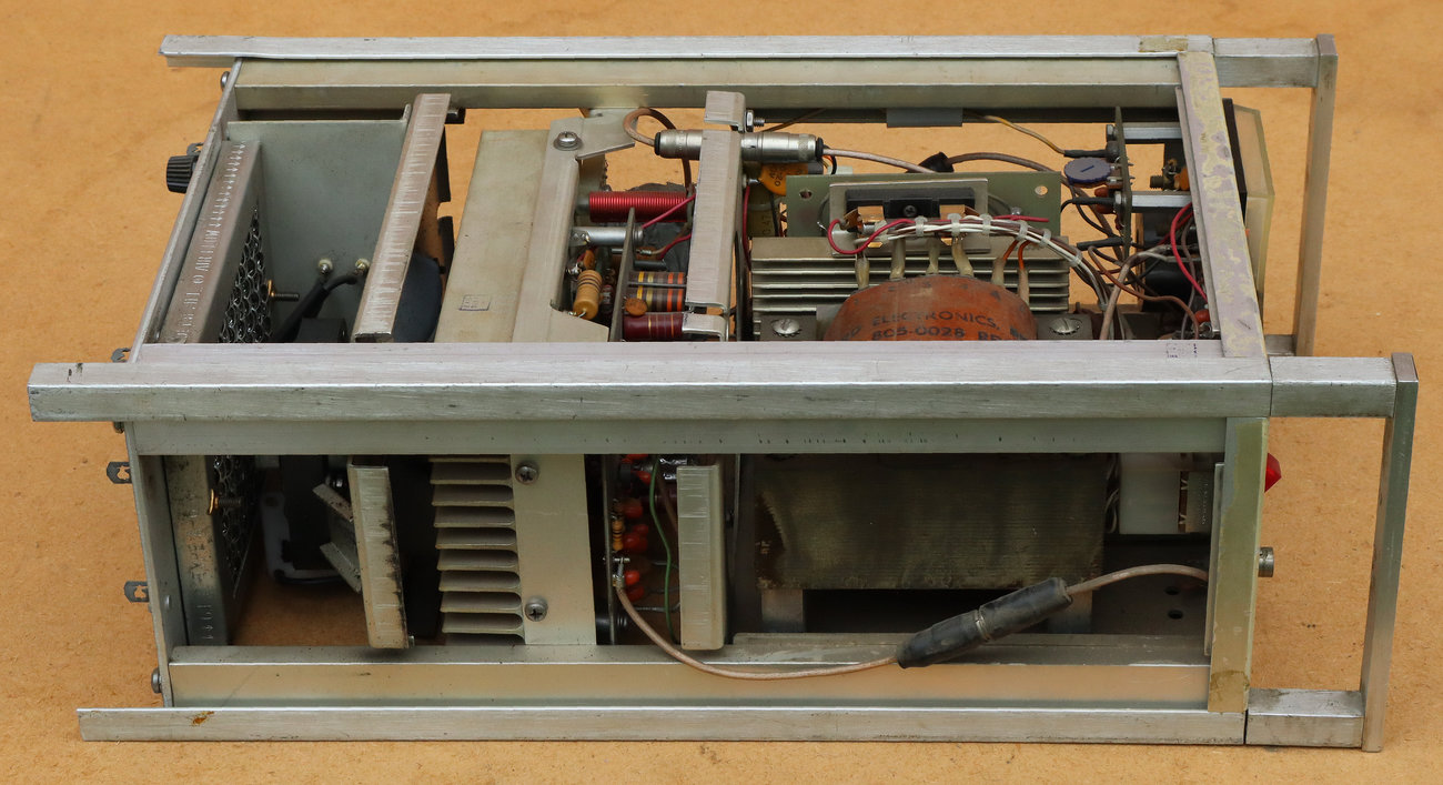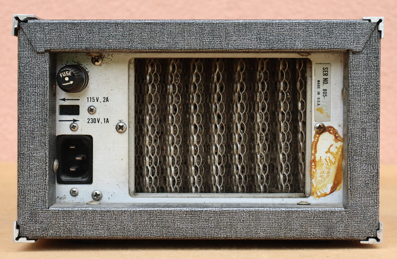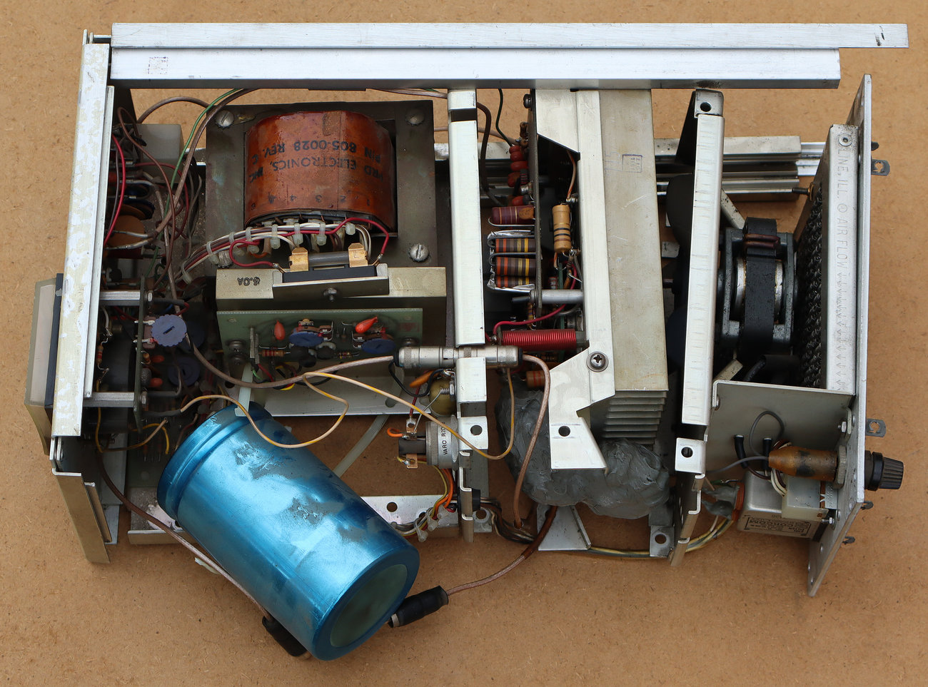 Mrežni transformator je prilično masivan. Na primarnoj strani je spori osigurač (MDL) od 1 A dok je na sekundarnoj strani brzi osigurač (AGC) od 4 A. Uz transformator je pločica regulatora napona. Iza pločice, na aluminijskom hladnjaku su montirana dva tranzistora (2N3054 i 2N3055) vjerojatno serijski regulacijski tranzistori.
