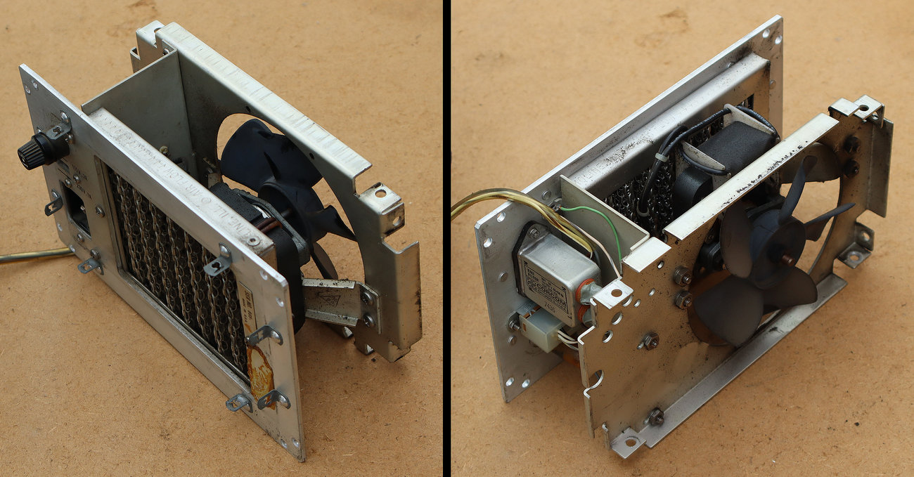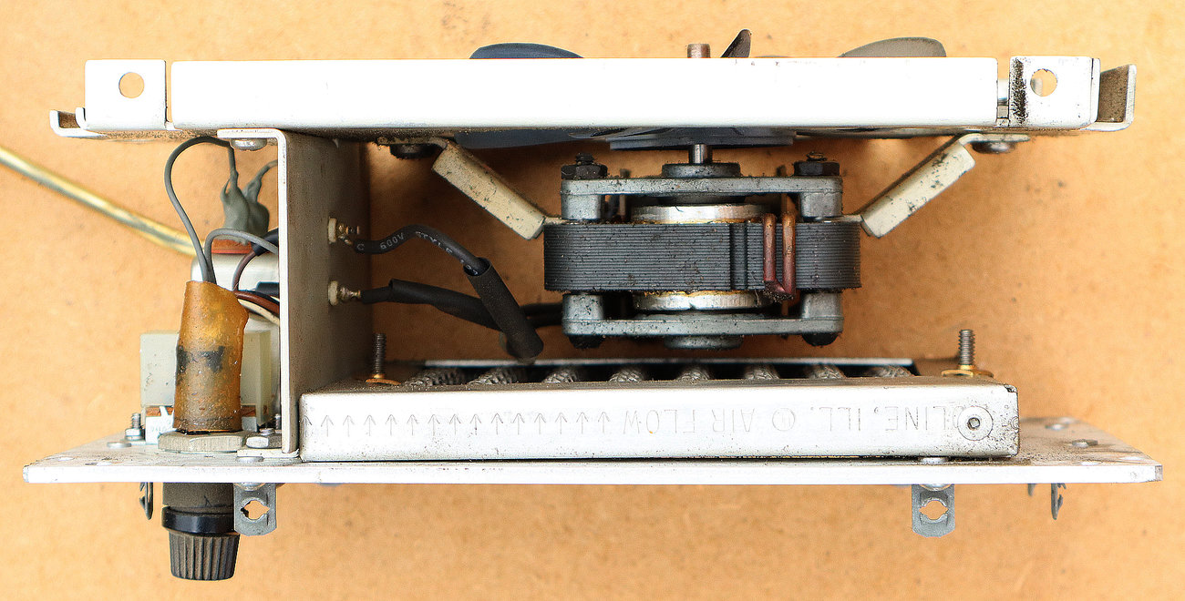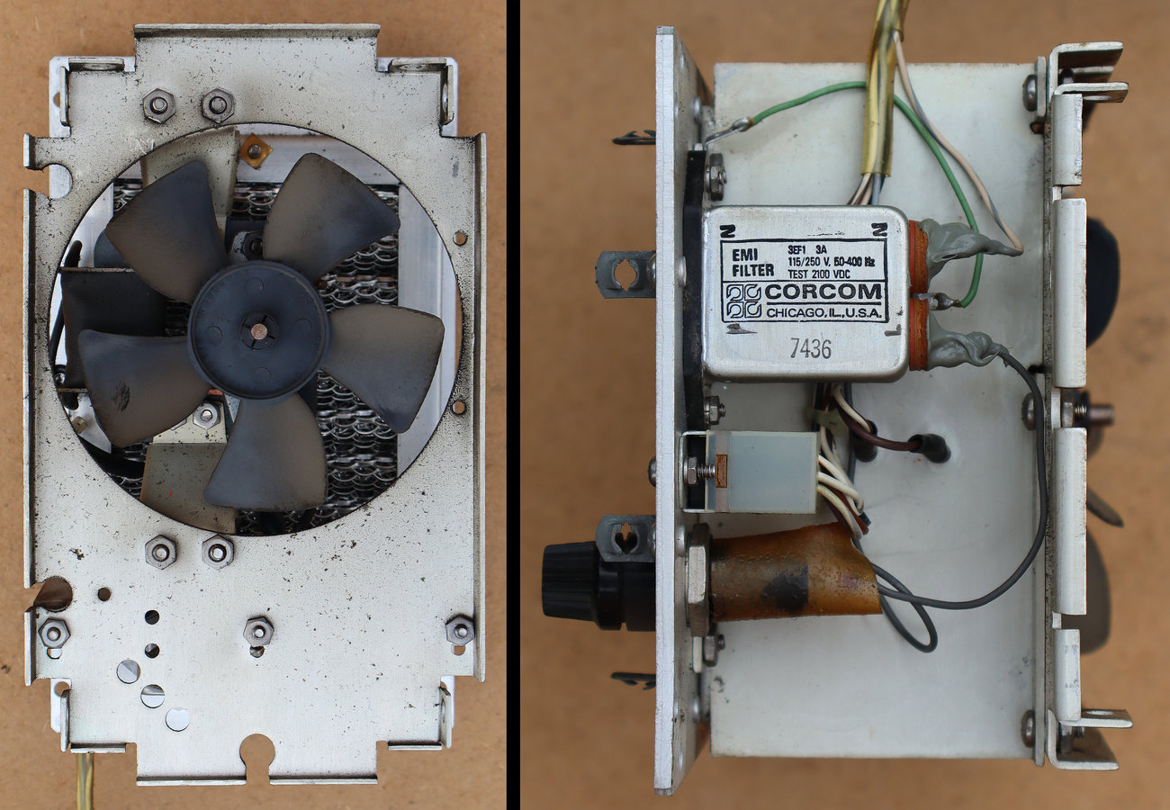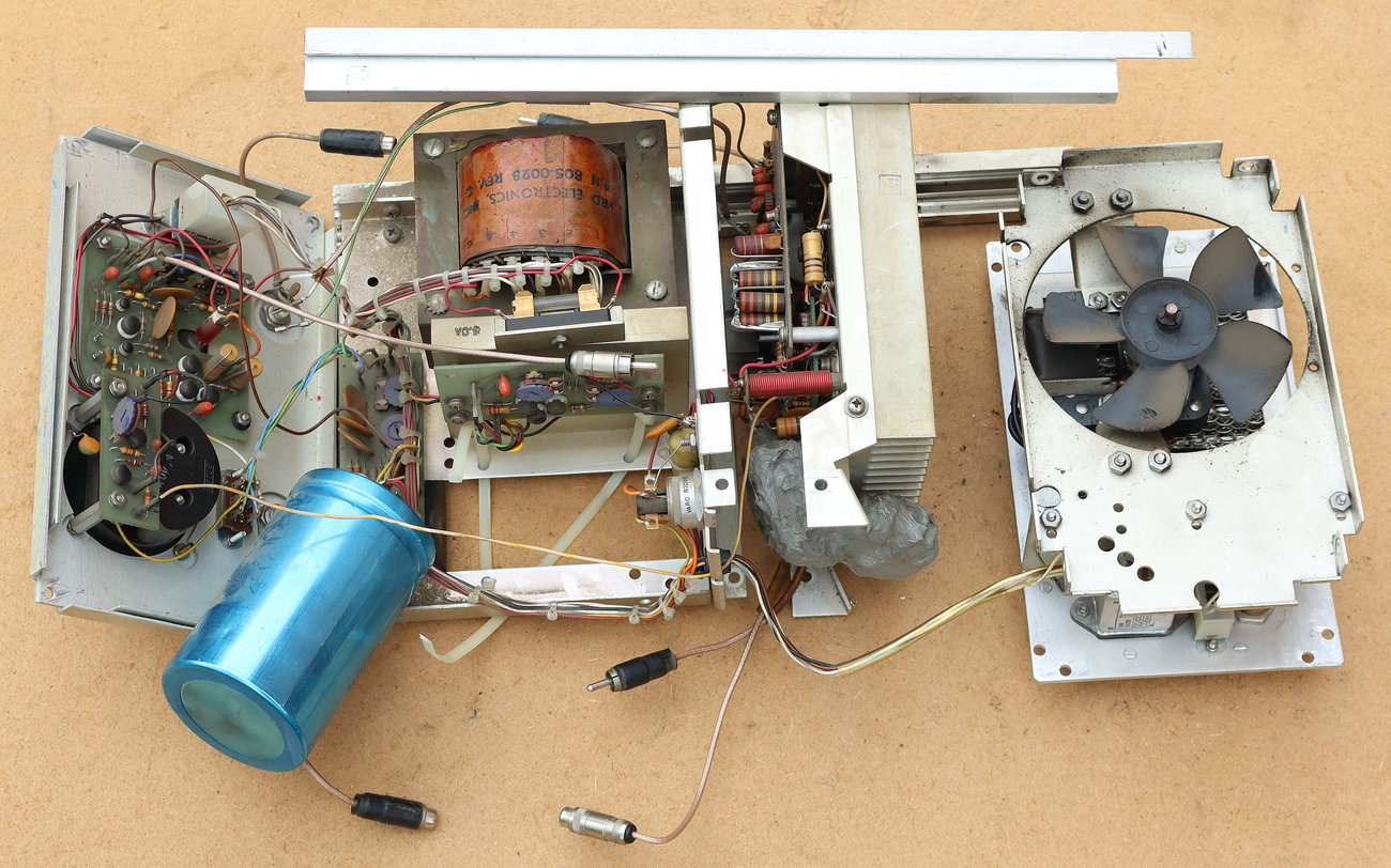 Ventilator aktivno hladi aluminijski hladnjak na koji je montirano šest izlaznih tranzistora VF pojačala. Desno na slici se vidi standardni EMI mrežni filtar (filtar visokofrekvencijskog elektromagnetskog šuma i smetnji) te ulazne mrežne komponente (utičnica i osigurač).
