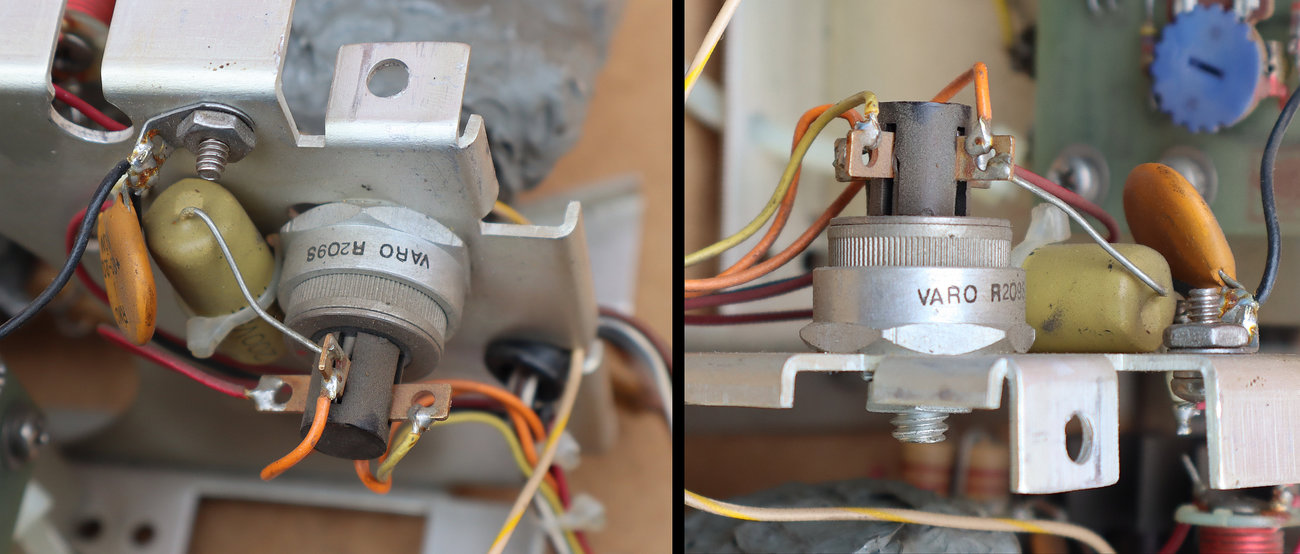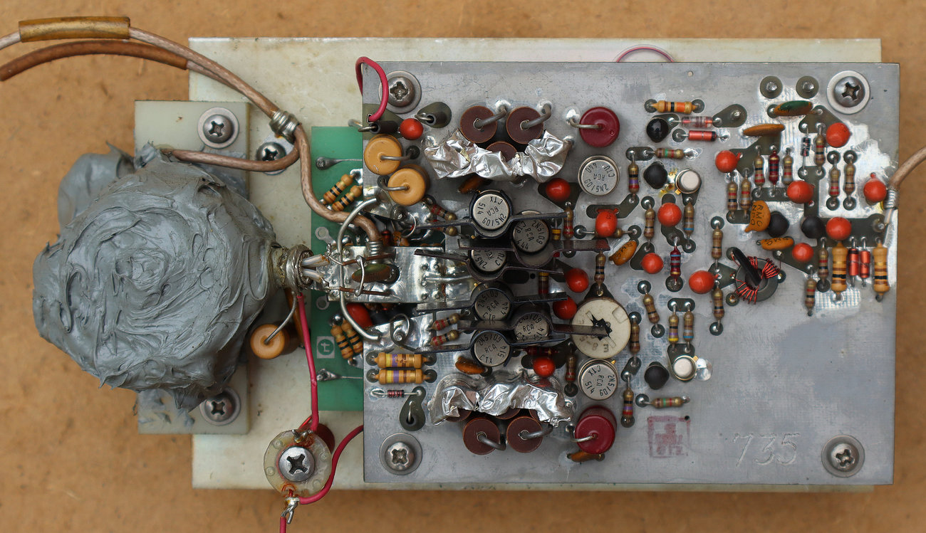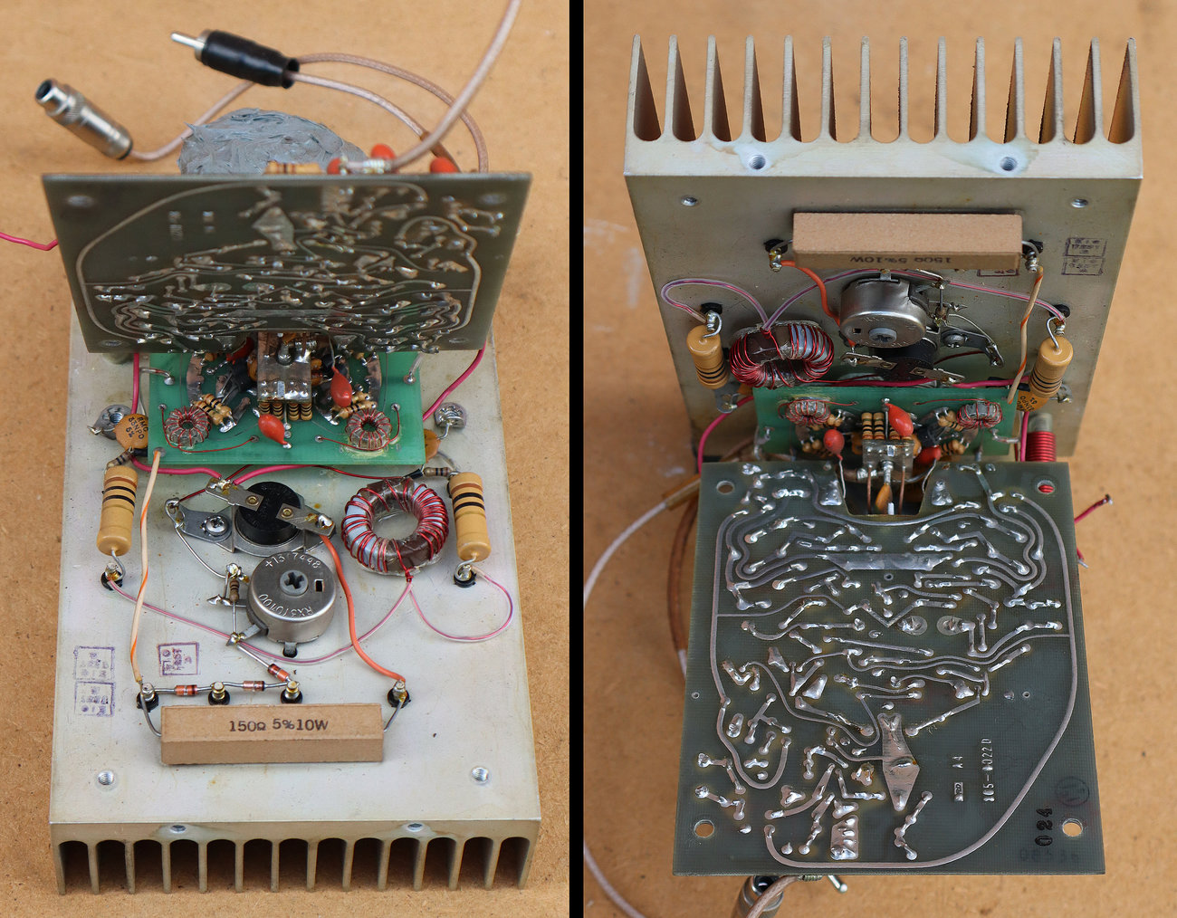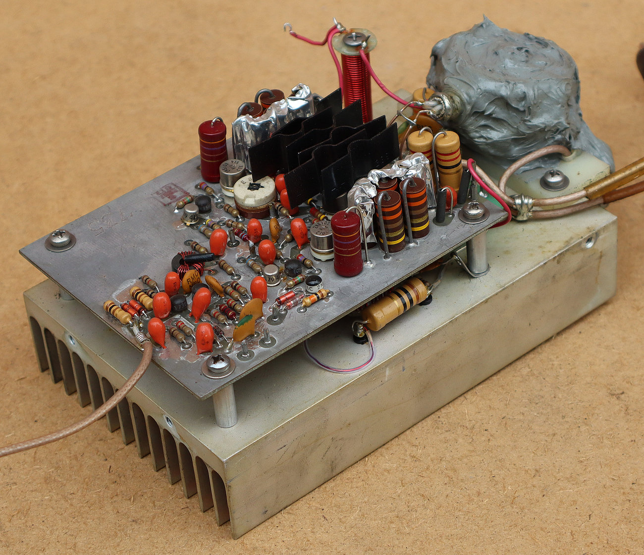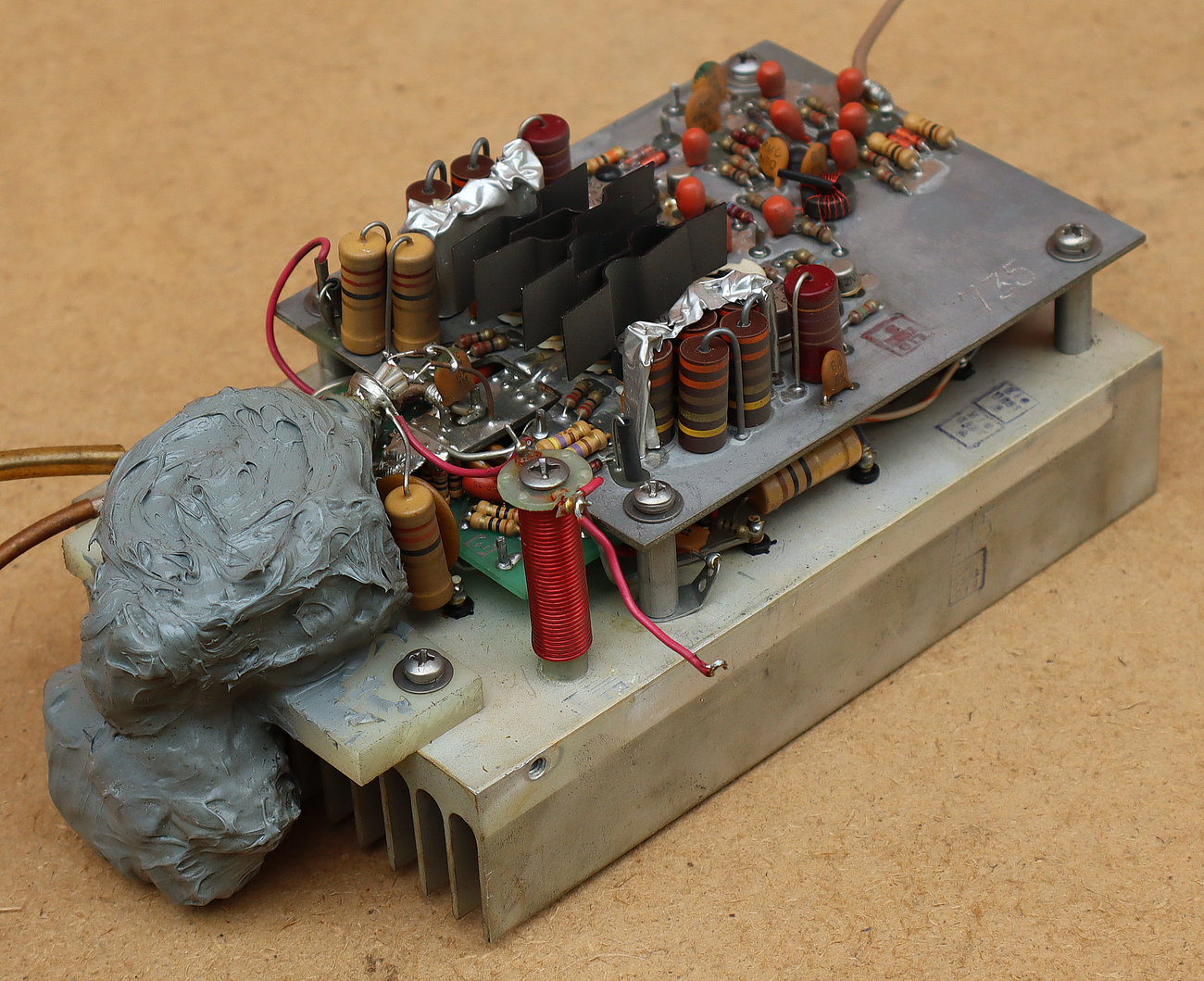 Pločica VF pojačala uključuje 21 tranzistor. U ulaznom dijelu su 2N3563 (x4), 2N5179 (x2) i 2N5133, slijedi osam drivera 2N5109 i na kraju šest izlaznih tranzistora sa internom Harris (Harris Technical Services Corp) oznakom QX958051. Za ove Harris tranzistore nisam našao nikakve podatke osim da se radi o NPN silicijskim tranzistorima 33 V / 3A. U sivoj izolacijskoj masi nalazi se izlazni transformator/VF filtar.