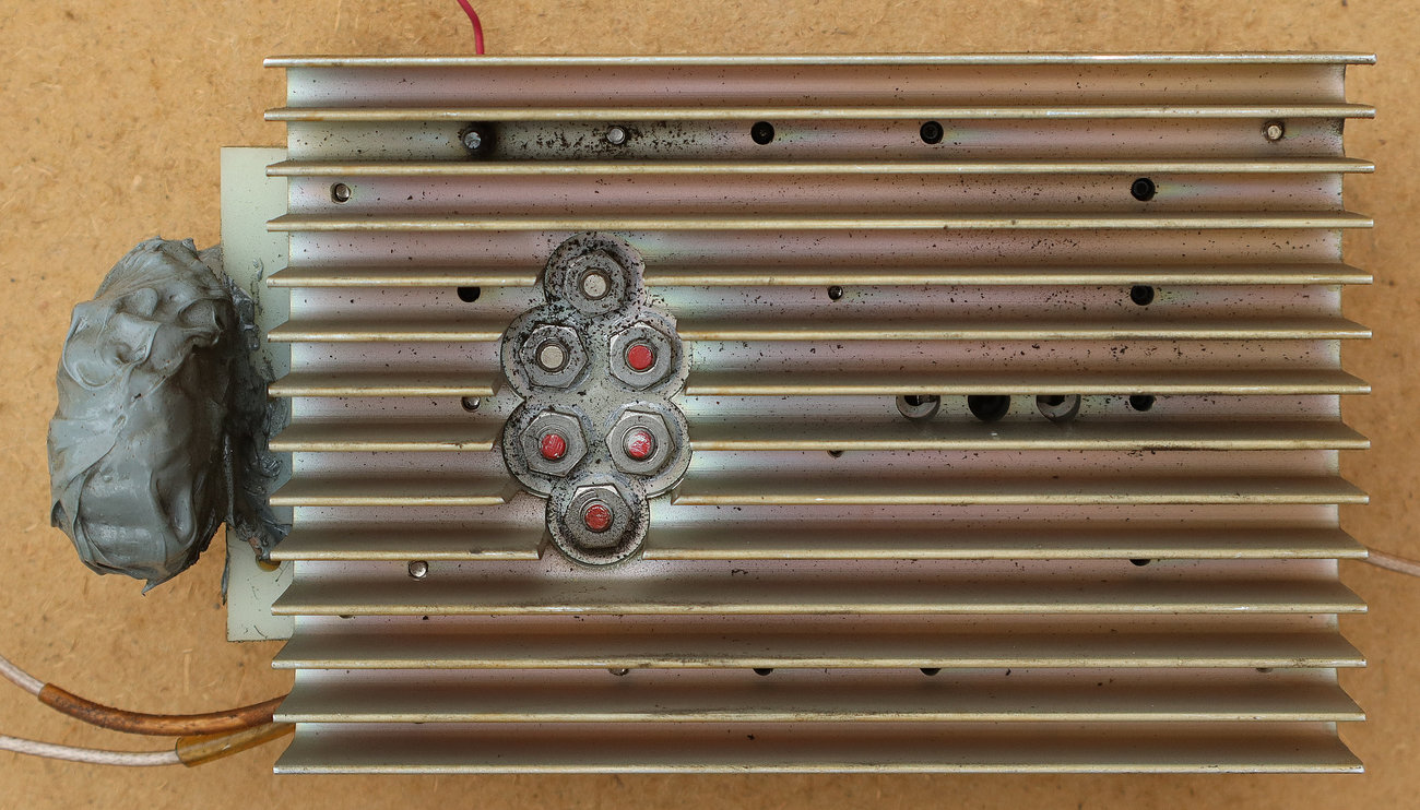Kad bi se baš zainatili za popravak, trebali bi rastaviti čitav uređaj na napajanje, VF pojačalo i mjerne krugove. Naravno, kad nemamo nikakve servisne podatke, provjera napajanja može biti samo okvirna. Svakako linija napajanja VF pojačala mora biti dobro filtrirana i stabilna i nikako ne većeg napona od nominalnih za ugrađene tranzistore. Ako je neki izlazni tranzistor neispravan, to je prvo teško provjeriti bez da se posve ne razleme i skinu sa hladila, a onda je problem i za zamjenu istih jer se taj tip tranzistora odavno ne proizvodi i nemamo sve ključne električne podatke za istog.