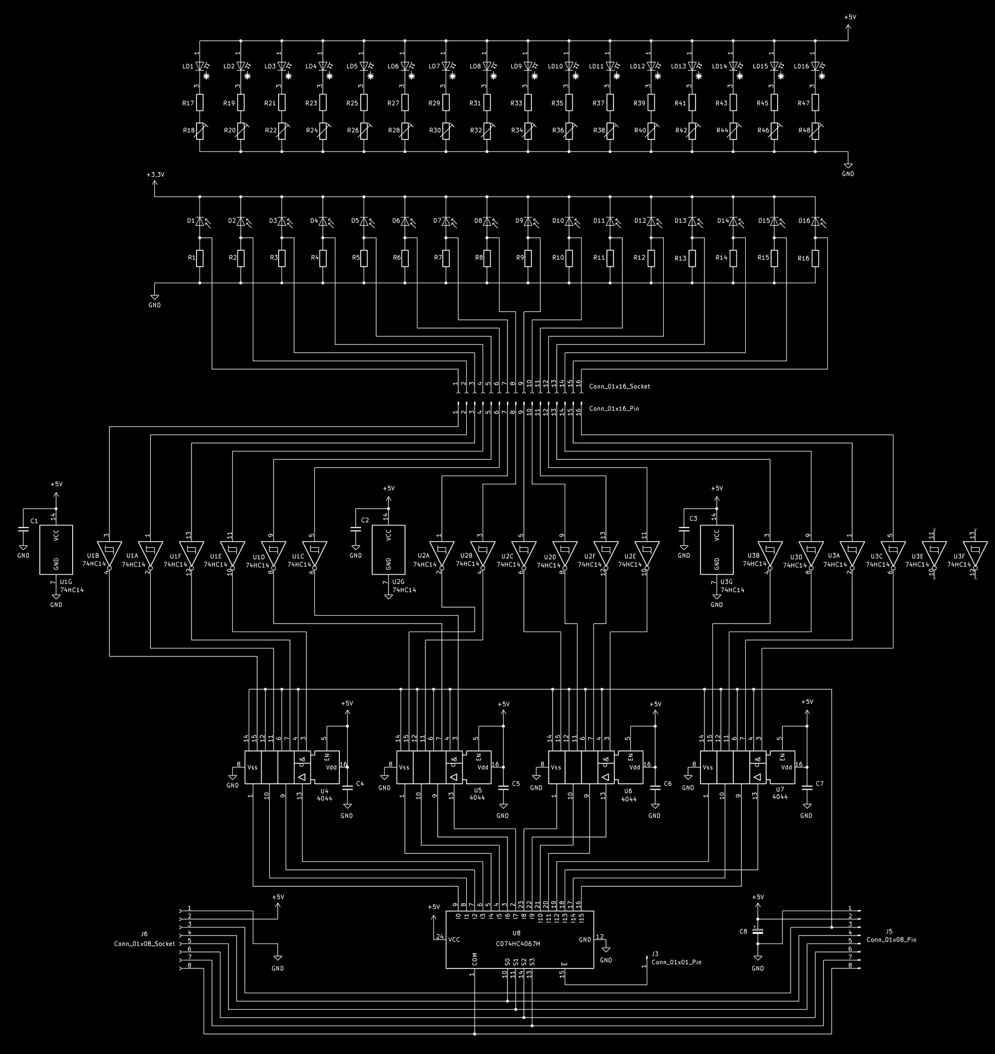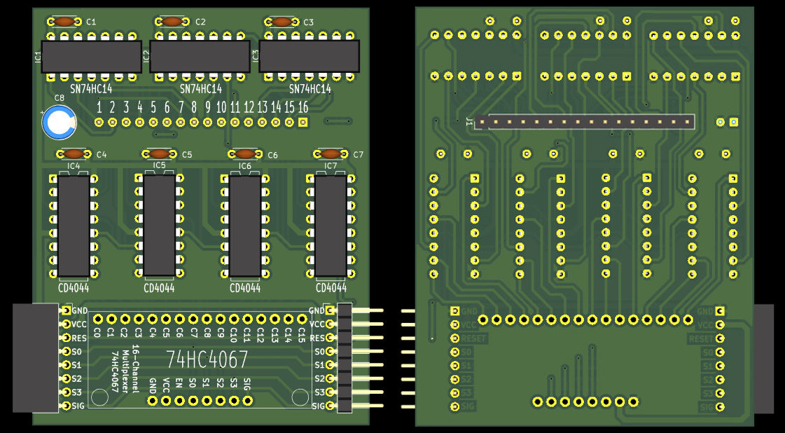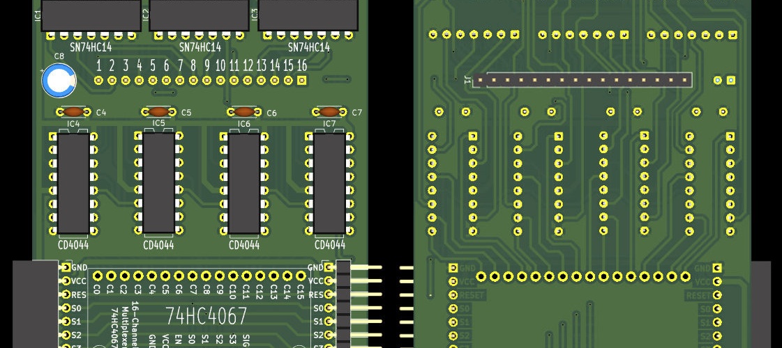 Prva zamisao je bila na jedan modul smjestiti 12 senzorskih kanala, što uključuje 2 x SN74HC14 i 3 x CD4044. Problem je što bi to narušilo modularnost multipleksora CD74HC4067 koji ima 16 kanala (trebalo bi više poveznih pinova između modula). Stoga sam se radije odlučio na module koji prihvaćaju 16 senzorskih kanala, dakle 3 x SN74HC14, 4 x CD4044 i 1 x CD74HC4067. Ovdje dva invertera ostaju viška, no to je toliko jeftin čip da se time ne treba zamarati. U konačnici će nam umjesto 22 trebati 24 komada ovih čipova.