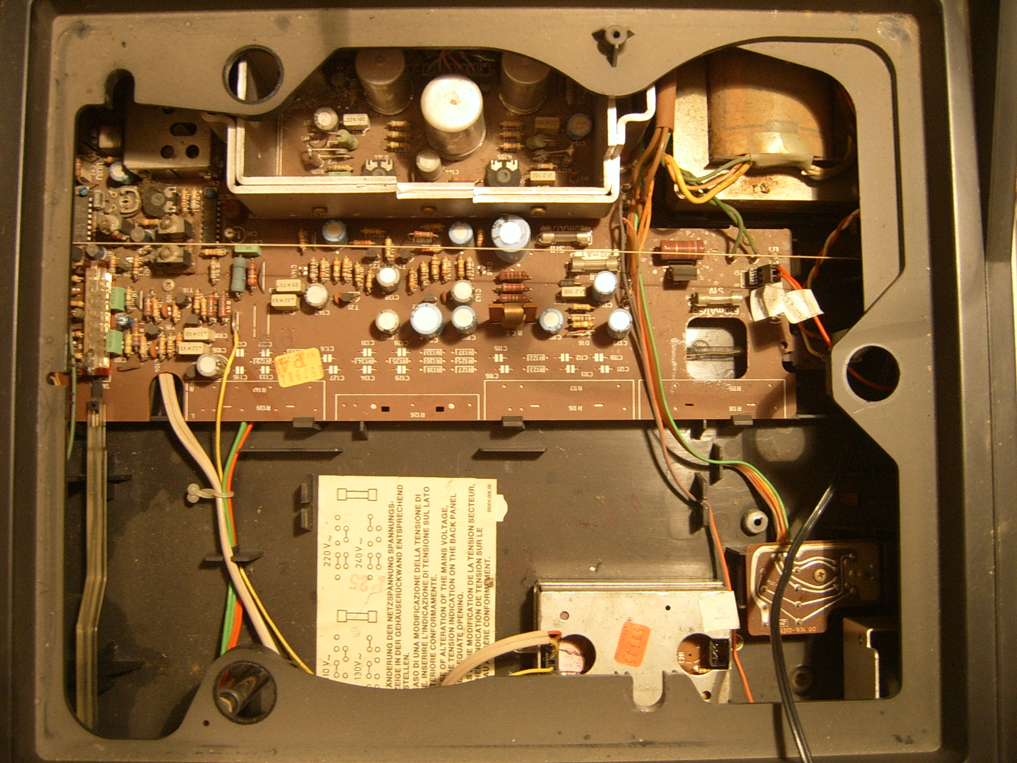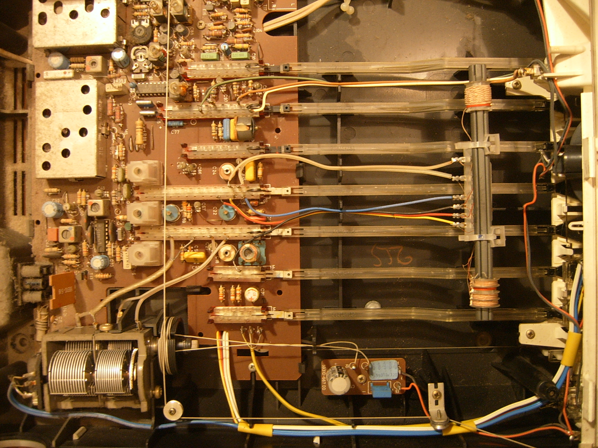 Ipak, za potpun i nesmetan pristup svim komponentana potrebno je odvojiti gornji od donjeg dijela kućišta. Radio prijemnik i izlazno pojačalo dijele istu pločicu, međutim, kontrole su na prednju ploču vezane na prilično neuobičajen način. Sve sklopke imaju relativno dugačke plastične produžetke, a mrežna sklopka je s prednjom pločom povezana preko špage koja se proteže kroz čitavu unutrašnjost u suprotni kut uređaja. Jednostavno se treba zapitati zar nije bilo jednostavnije montirati sklopku na prednju ploču, a zatim ju žicama spojiti na željeno mjesto na tisklanoj pločici, nego razvlačiti mehanizme pokretanja sklopke preko cijelog kućišta.