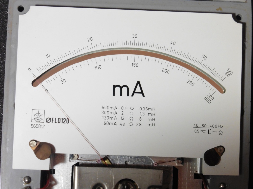 Na slici ispod vidimo instrument ampermetra. Uočava se da se radi o identičnom mehanizmu kao i kod voltmetra. Razlika je samo u zavojnicama koje su umetnute u željeznu jezgru (stator) instrumenta. Kod voltmetra to su bile dvije zavojnice (2 x 2,5Ω / 2,4 mH), a kod ampermetra imamo četiri zavojnice: dvije od 1Ω / 0,65 mH i dvije od 22Ω / 12 mH. Serijskom i paralelnom kombinacijom ovih zavojnica preko sklopke za mjerne opsege dobivaju se vrijednosti potrebne za pojedine opsege koje su naznačene na skali instrumenta.