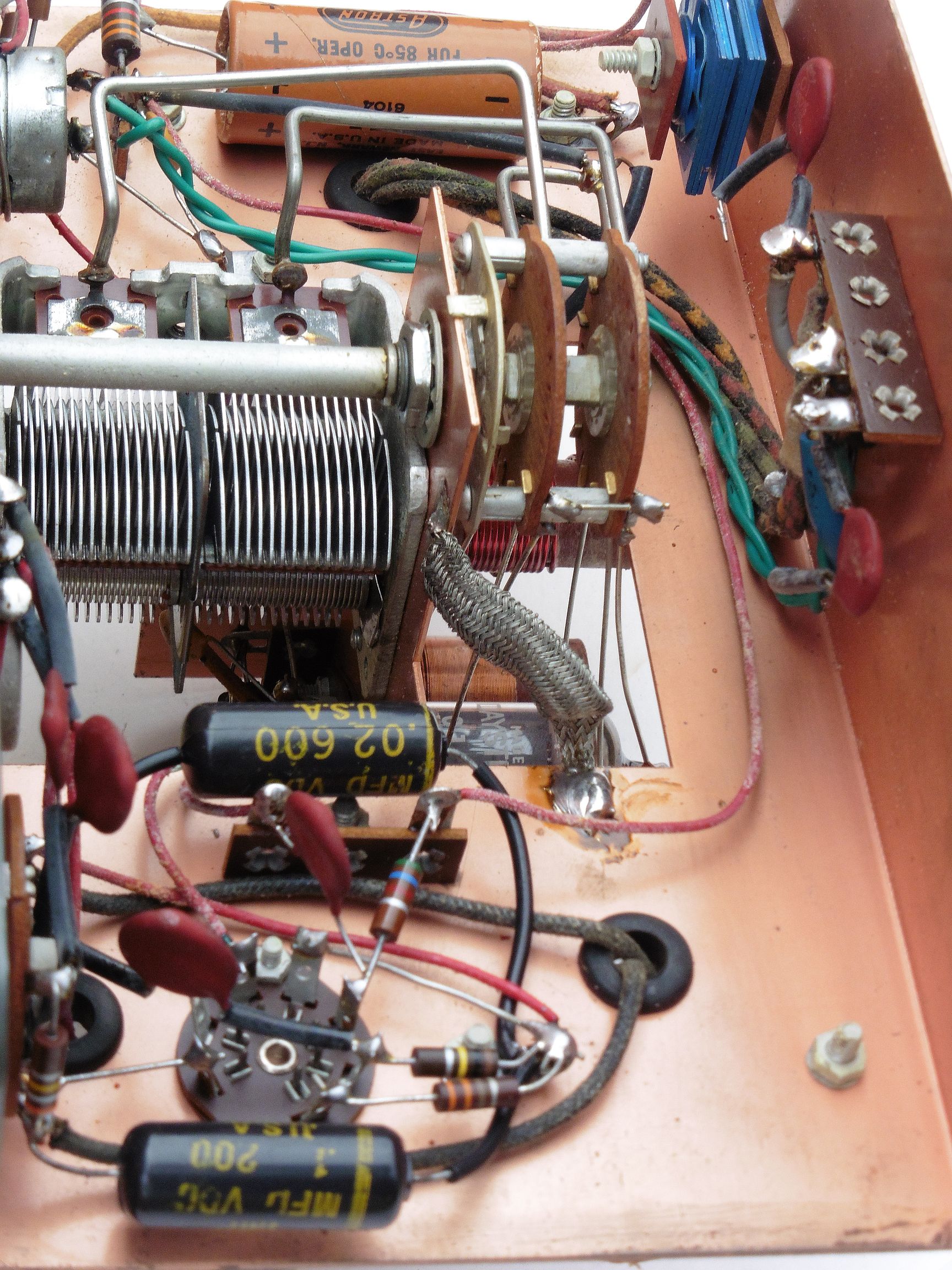 Colpittsov tip oscilatora lako ćemo prepoznati u shemama po serijskom spoju dva kondenzatora koji čine naponski djelitelj i sa tog spoja se uzima signal povratne sprege. U našem slučaju to je postignuto pomoću dva odvojena statora promjenjivog kondenzatora (na shemi su označeni sa 450 – 450 MMF gdje je MMF = pF). Upotreba dva promjenjiva kondenzatora na istoj osovini kod Colpittsovog oscilatora ima nekih prednosti pred kombinacijom jednostrukog promjenjivog kondenzatora sa dva fiksna kondenzatora. Naime, kako se frekvencija signala koji prolazi kroz kondenzatore povećava tako se prividni otpor kondenzatora smanjuje. Tako ćemo kod fiksnih kondenzatora povećanjem frekvencije jednom doseći točku gdje će prividni otpor kondenzatora toliko pasti da se oscilacije više neće moći održavati. Kod promjenjivih kondenzatora ovaj se problem automatski kompenzira, jer kako okretanjem ploča kondenzatora povećavamo frekvenciju oscilatora, tako istovremeno smanjujemo kapacitet kondenzatora, pa prividni otpor istih ostaje relativno konstantan u širokom rasponu frekvencija.