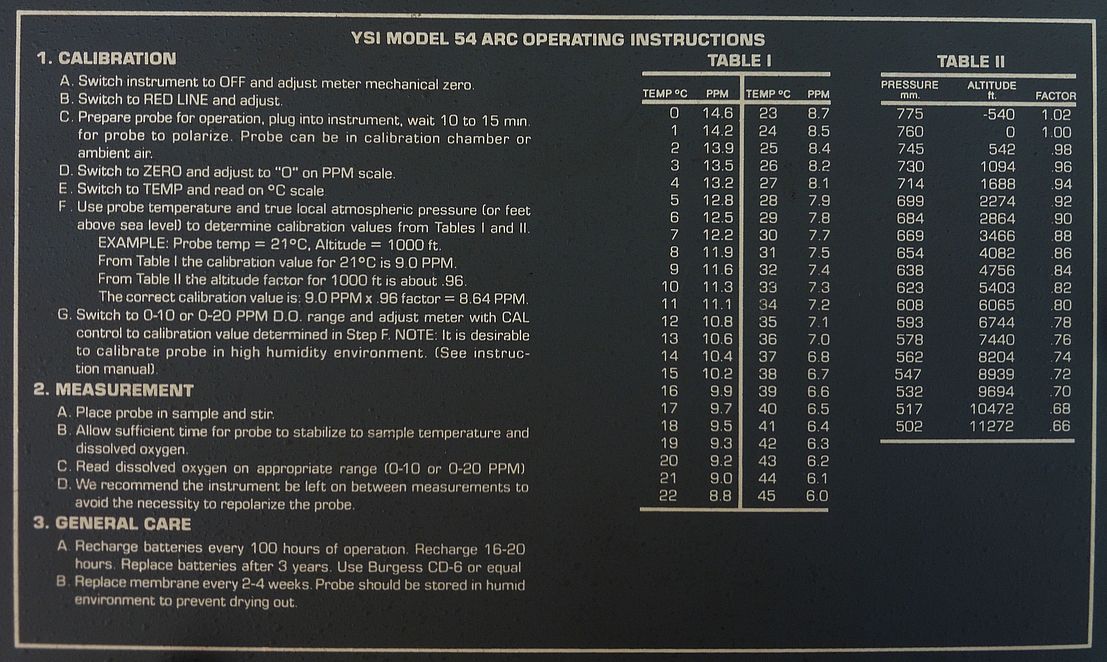 Kompenzacija tlaka i temperature je dakle veoma važna za točno mjerenje otopljenog kisika u vodi pa se na kućištima našeg oksimetara nalaze kalibracijske tablice za ove dvije veličine te opis kompletnog postupka kalibracije, mjerenja i računanja konačnog rezultata.
