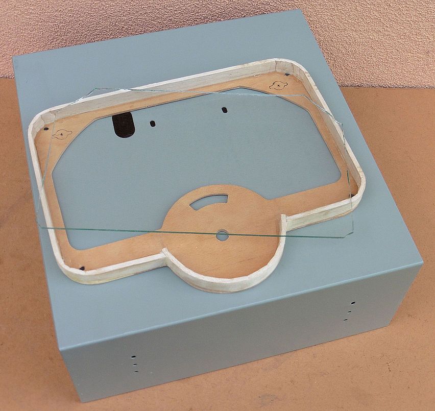 Nakon što su rubovi od balze zalijepljeni za prednju stranu od šperploče slijedilo je brušenje rubova kako bi se dobile kosine i zaobljenja istovjetna originalu. Sada je trebalo pojačati rubove maske na mjestima gdje će se ista vijcima protegnuti na prednju ploču uređaja te napraviti ležište koje će fiksirati zaštitno staklo.