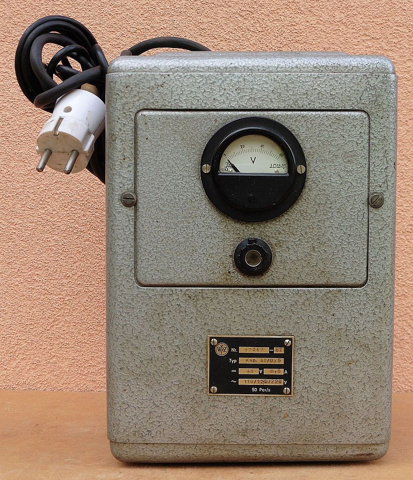 Logo proizvođača nismo uspjeli identificirati no vidimo da je ispravljač vrlo jednostavan, te se sastoji samo od transformatora, promjenjivog žičanog otpornika i punovalnog diodnog ispravljača koji je zamijenjen domaćom komponentom. Potrebni točni napon napajanja namješta se odabirom jednog od tri izlazna napona (36 , 42 ili 48 V) te finom regulacijom pomoću promjenjivog žičanog otpornika, a vrijednost napona može se pratiti na ugrađenom voltmetru. Iz nekog razloga prijašnji vlasnik je odspojio kućište osigurača te je osigurač izravno zalemljen na izlaznu žicu.