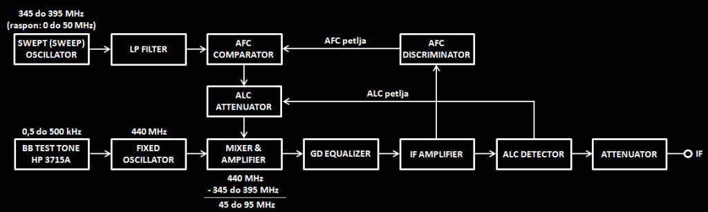 Generator signala za testiranje telefonskih komunikacijskih linkova mora imati vrlo stabilne izlazne frekvencije i što je moguće više linearnu karakteristiku snage u čitavoj širini generiranog opsega. Kod generatora HP 3710A međufrekvencija (MF ili engl. IF) dobiva se miješanjem frekvencija koje generiraju dva UHF oscilatora. FIXED OSCILLATOR radi na fiksnoj frekvenciji od 440 MHz i on se modulira NF signalom iz BB (Baseband) generatora testnih tonova HP 3715A. Drugi oscilator (SWEPT OSCILLATOR) može automatski stalno mijenjati svoju frekvenciju u maksimalnom rasponu od 50 MHz, odnosno radi u opsegu 345 do 395 MHz. Tako na izlazu iz mješača (MIXER) možemo dobiti BB signal koji čine modulirane MF u rasponu 45 do 95 MHz. U ovakvom dizajnu sklopova NF modulacijske frekvencije i sweep oscilator ne mogu doći u interakciju sa eventualno nelinearnom karakteristikom VCO-a pa intermodulacijske smetnje mogu nastati jedino u mješaču i njegovom izlaznom pojačalu. Intermodulacije u mješaču su u pravilu neznatne no u izlaznom pojačalu može doći do određenih kašnjenja signala što se onda izjednačava odgovarajućim linijama u stupnju GD EQUALIZER. Visoke UHF frekvencije oscilatora odabrane su zato da se dobije što linearnija frekvencijska skala unutar generiranog radnog opsega i da se što je moguće više smanji mogućnost pojave smetnji, odnosno neželjenih signala unutar frekvencijskog opsega (spurious frekvencije).