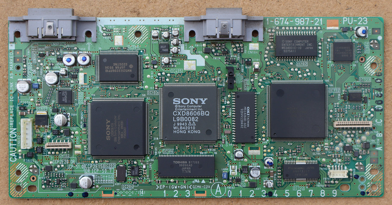 Usporedni prikaz elektroničkih pločica PS One SCPH-102, PS1 SCPH-9002 i PS1 SCPH-7502 konzola. Na prvoj i zadnjoj pločici se jasno vide ugrađeni MOD Chipovi za zaobilaženje regionalnih ograničenja i zaštite od kopiranih CD-ova.