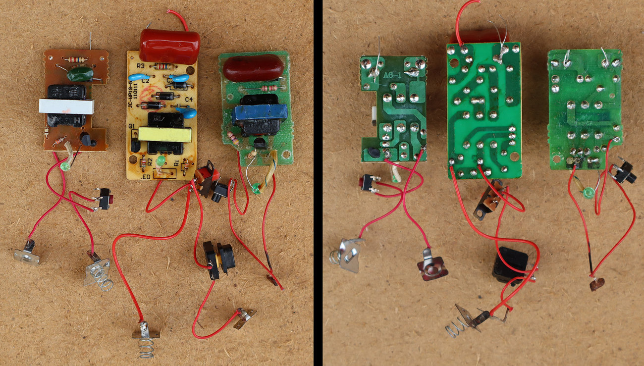Elektronika u električnim repelentima kao što vidimo nije kompleksa i začudo ne sadrži namjenske čipove i mikrokontrolere 🙂 Shema je zapravo prilično primitivna. Može se vidjeti da je u sva tri slučaja centralna komponenta mali visokonaponski transformator gdje je na primarnoj strani radi tranzistorski oscilator, a na sekundarnoj strani su VN diode i kondenzatori. Napajanje je u sva tri slučaja 3 V (2 x AA 1,5 V).