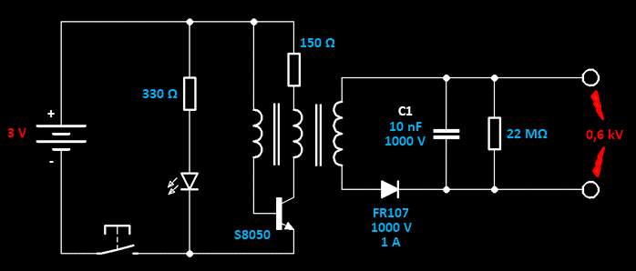 Ovo je najjednostavnija izvedba od naša tri VN električna repelenta. Primar visokonaponskog transformatora pogoni vrlo jednostavan impulsni (bloking, relaksacijski) tranzistorski oscilator kojem se oscilacije na bazi tranzistora podržavaju preko posebnog namotaja na VN transformatoru. Za razliku od sinusnih oscilatora, gdje tranzistor stalno radi kao pojačalo, kod ovakvih impulsnih oscilatora tranzistor je gledano u vremenskoj domeni većinu vremena zatvoren (u mirovanju, ne vodi), a otvoren je samo u kratkom vremenu dok proizvodi impuls. S obzirom da je većinu vremena tranzistor zatvoren (blokiran) ovakvi oscilatori se ponegdje zovu bloking oscilatori. Jednako tako se koristi i termin relaksacijski oscilator jer nakon dužih vremena relaksacije (mirovanja) slijedi kratko impulsno (aktivno) razdoblje. Međutim, termin relaksacijski oscilator se koristi i za sve druge oscilatore koji proizvode izlazni signal različit od sinusnog (pravokutni, trokutasti, pilasti i slično).