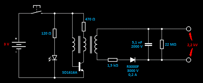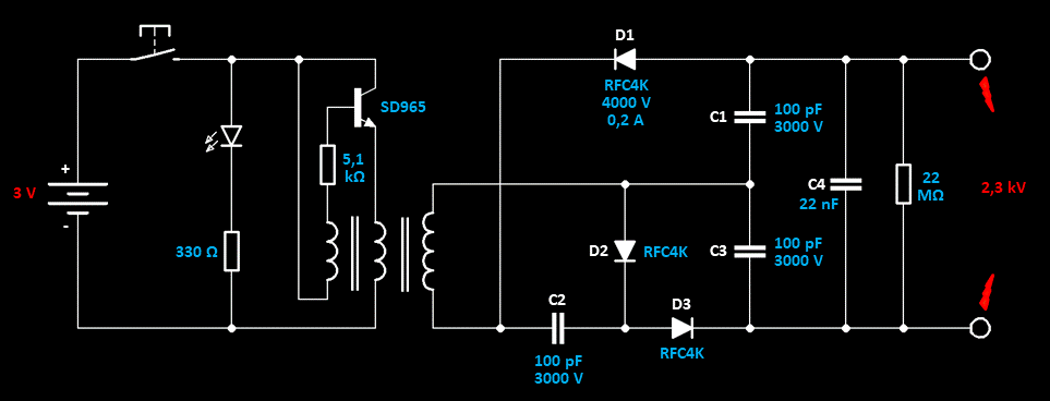 Što se tiče utrostručivača napona, vidimo da ovo nije uobičajeni spoj Cockcroft-Walton kaskadnog umnoživača napona kakav često susrećemo u našim objavama (vidi objavu Ionizator zraka – AETE). Ovo ovdje je kombinacija poluvalnog ispravljača (D1, C1) i udvostručivača napona sa D2/C2 i D3/C3. Poluvalni ispravljač D1, C1 je isti kao u prethodna dva primjera i C1 će se nabiti na vršni napon koji daje sekundar transformatora (na cca 700 V). Udvostručivač napona D2/C2 i D3/C3 ima dva stupnja te se na izlaznom kondenzatoru C3 dobiva dvostruki napon od cca 1400 V. Izlaz se zatim uzima sa serijskog spoja kondenzatora C1 (ispravljač) i C3 (udvostručivač) na kojima su naponi od 700 V i 1400 V, dakle ukupno 2100 V.
