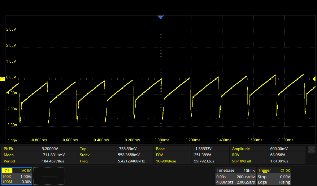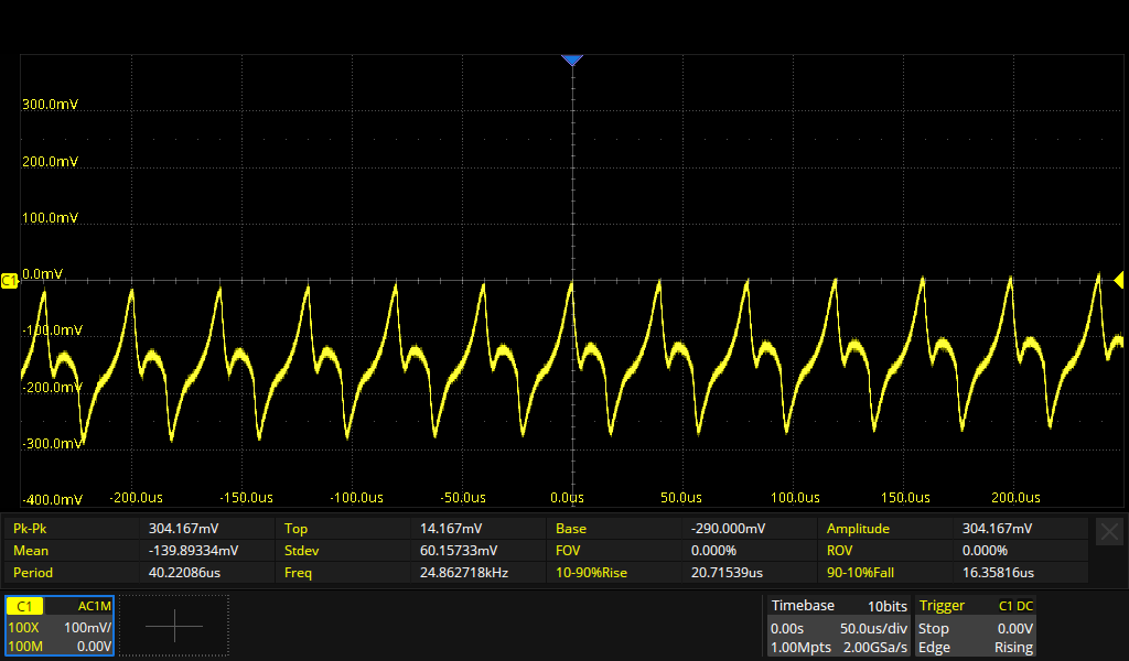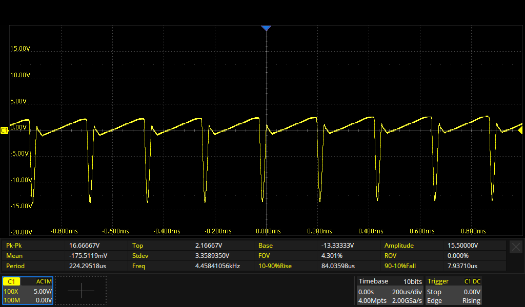 Zbog 3,5 puta većeg izlaznog napona ovdje na istom unutrašnjem otporu osciloskopa mjerimo i jednako toliko puta veće vršne amplitude napona nego u prvom primjeru. Međutim, u ovom drugom primjeru je frekvencija oscilatora nešto niža, oko 4,5 kHz, te je upotrijebljen kondenzator dvostruko manjeg kapaciteta (5,1 nF umjesto 10 nF). Zbog ovoga je i mogućnost zadržavanja napona na kondenzatoru pod opterećenjem puno manja nego u prvom primjeru. Možemo primijetiti kako su strmine zadržavanja napona između impulsa puno više u prvom primjeru nego ovdje gdje su gotovo vodoravno položene. Ovdje gotovo da i ne preostaje zadržan nikakav napon na kondenzatoru nakon impulsa, isti se odmah potroši preko opterećenja.