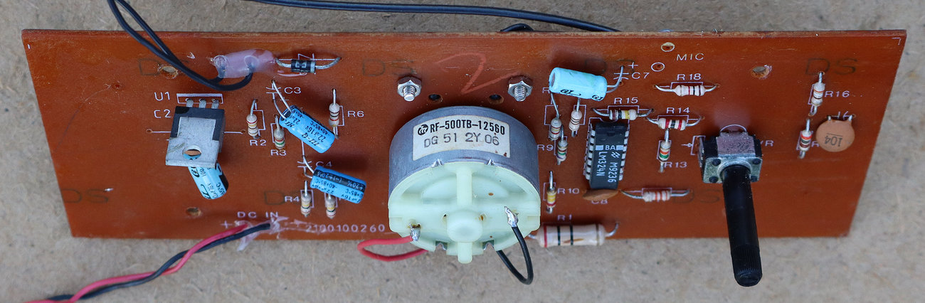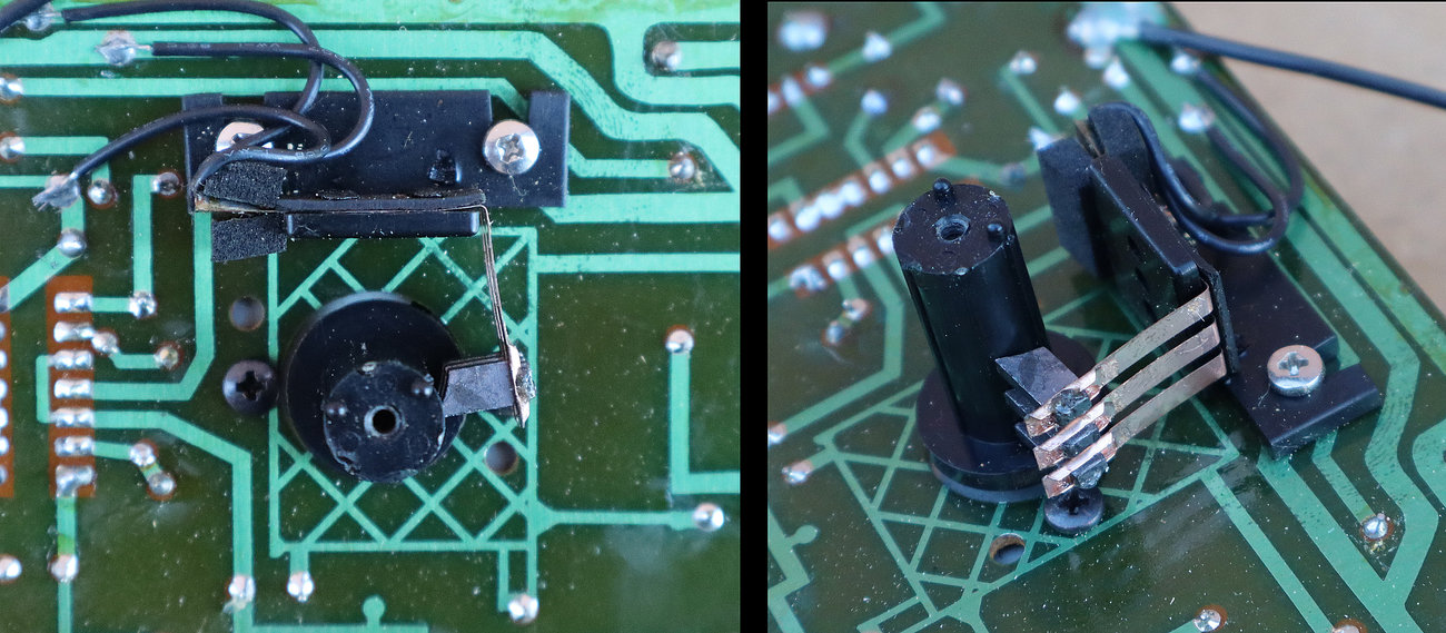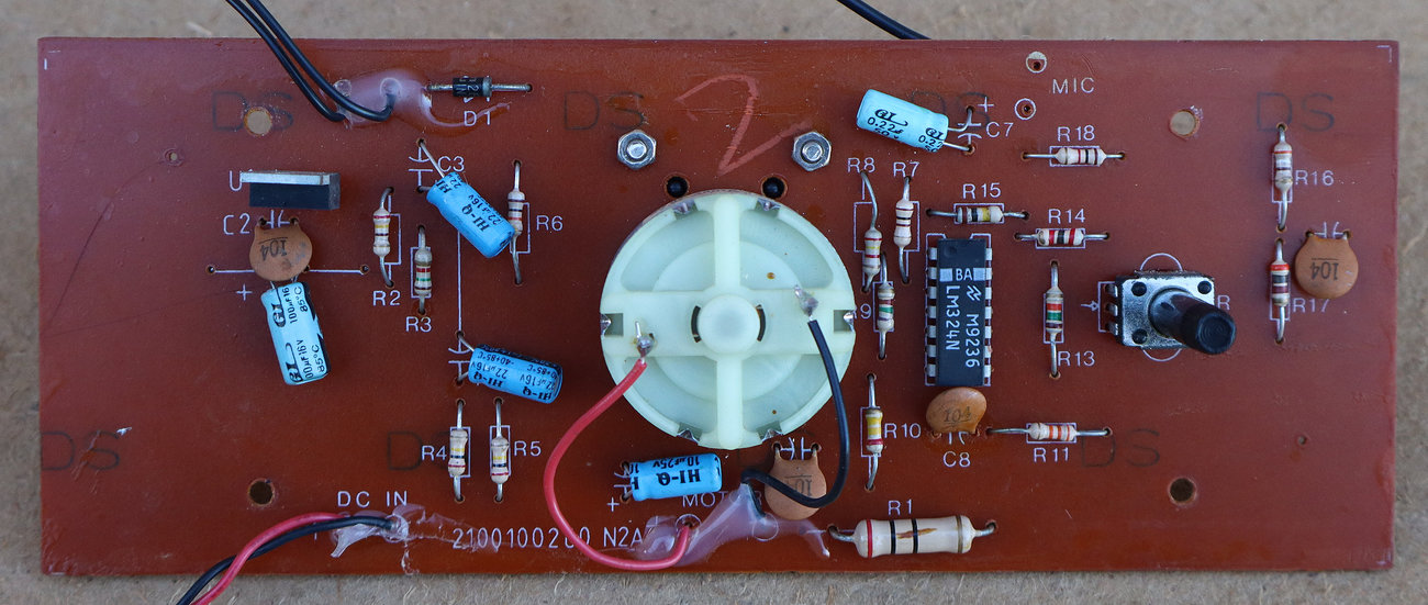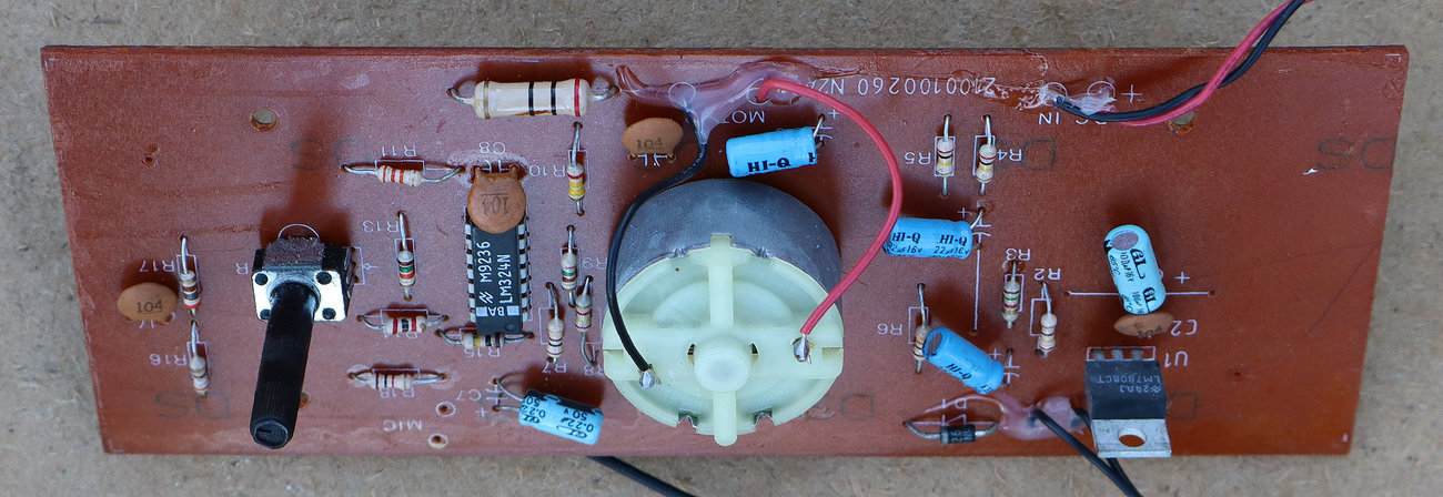 Preko tri klizna prstena prenosi se napajanje (8 V) i mikrofonski signal sa fiksne pločice sa mikrofonskim pojačalom na rotirajuću pločicu sa LED diodama.