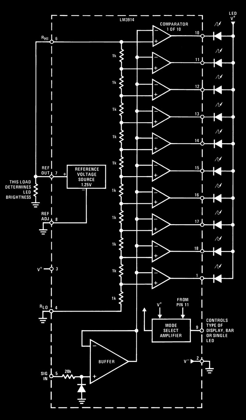 Blok shema integriranog kruga LM 3914. Vidi se da paljenjem svake LED upravlja komparator koji uspoređuje ulazni napon sa referentnim naponom. Referentni napon pak se za svaku LED redno smanjuje za iste vrijednosti preko otporničkih djelitelja sa otpornicima od 1 kΩ.