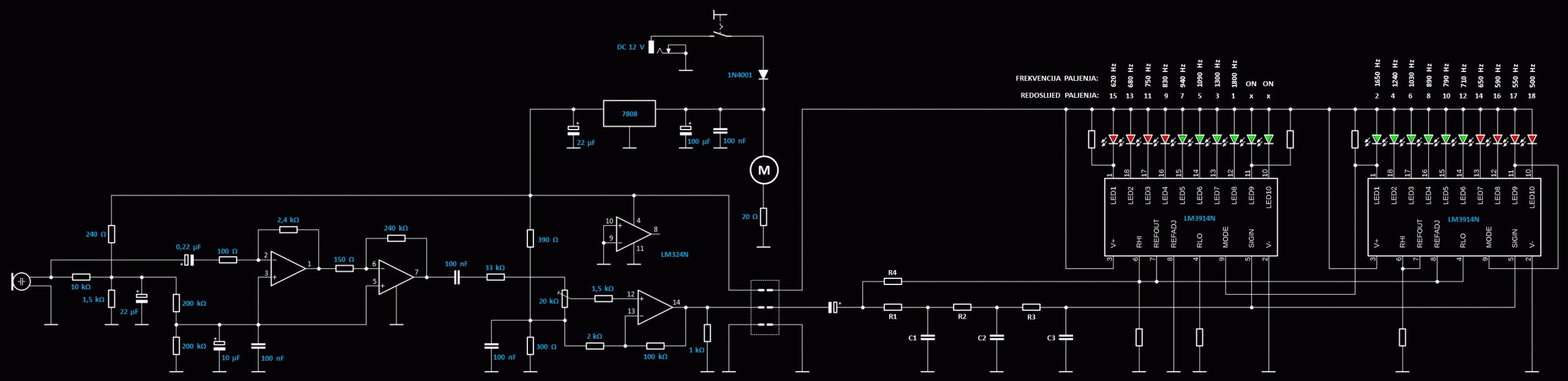 Pojačani signal se dalje grana na dva dijela. Jedan dio se preko otpornika R4 vodi na referentne pinove čipova LM 3914 kojima se određuje napon paljenja LED dioda. Time paljenje LED ovisi o jačini ulaznog (mikrofonskog) signala. Drugi dio ulaznog signala se vodi na 3-stupanjski niskopropusni RC filtar sa otpornicima R1-R3 i kondenzatorima C1-C3, a zatim na ulazne pinove čipova LM 3914. Time je paljenje LED ovisno i o frekvenciji ulaznog (mikrofonskog) signala. Što su frekvencije više, to će ih filtar bolje gušiti, te ćemo na izlazu imati manje amplitude (napone) tih frekvencija.