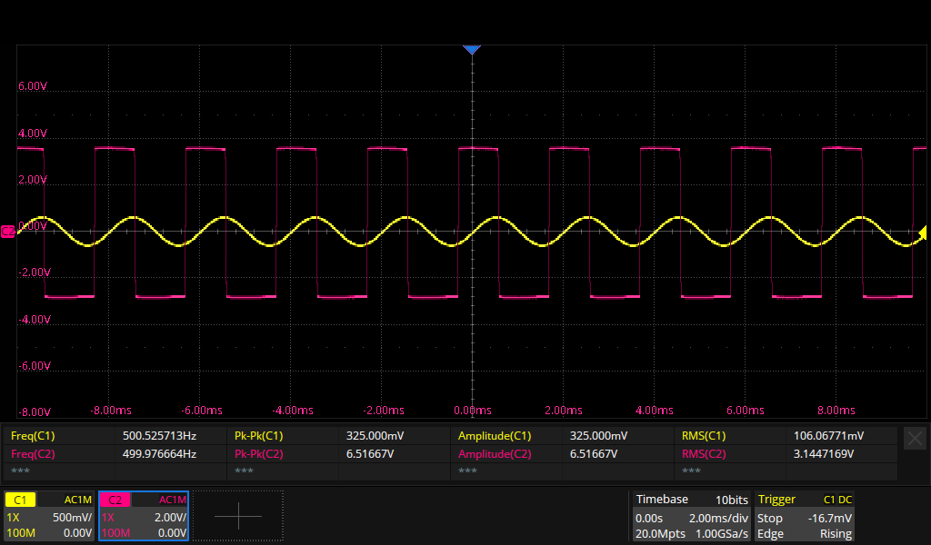 Izlaz iz mikrofonskog pojačala je sličan pravokutnom valnom obliku jer pojačalo brzo ulazi u zasićenje (maksimalno pojačanje) te su vrhovi sinusoida odrezani.