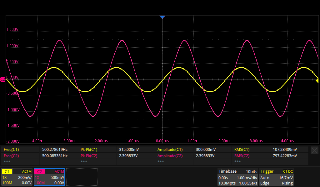 U mikrofonskom pojačalu rade tri stupnja operacijskih pojačala i isto je proračunato tako da daje što veće naponsko pojačanje. Moj signal generator generira najniži napon od 4 mVpp i već kod tog ulaznog napona pojačalo ulazi u zasićenje te dobivamo maksimalni napon 6,5 Vpp. Pojačanje je moguće smanjiti potenciometrom SENSITIVITY na zadnjoj strani kućišta.