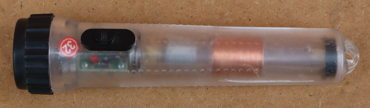 Na našem primjerku lažne indukcijske svjetiljke magnet je pravi i zavojnica je ispravno spojena na diodni mosni ispravljač, te dalje na kondenzator, bateriju i LED. Međutim, glavni razlog za ovo je taj što je ugrađena mala crvena indikacijska LED koja bljesne svaki put kad magnet prođe kroz zavojnicu. Tako kupac ima dojam da svjetiljka nije lažna i da induktor radi. Međutim, iako induktor doista radi, zbog nedostatka superkondenzatora ili punjivih baterija, električna energija iz istog se može nigdje pohraniti. Struja koju daje induktor izravno, dovoljna je tek da se LED počne jedva vidljivo paliti. Kondenzator od 1000 µF / 10 V se nabije na oko 6-7 volti koliko efektivno može dati induktor, no pohranjena energija je dovoljna tek za jedan kratkotrajni bljesak koji traje tek djelić sekunde.