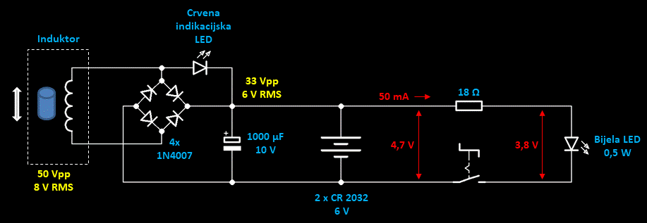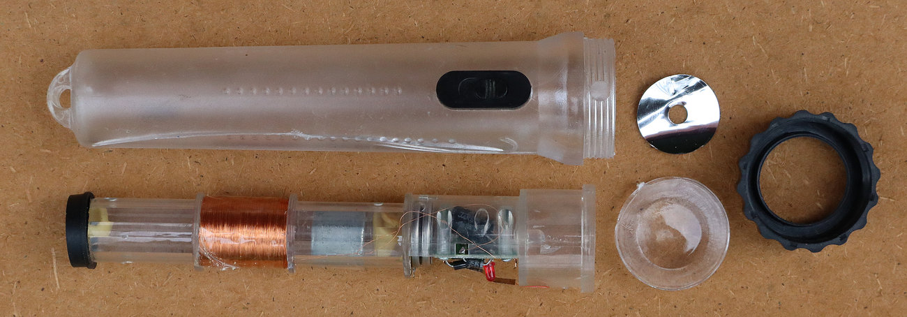 Ipak, nije jasno zašto se krug napajanja iz induktora nastavlja dalje na jednokratne baterije, kondenzator i glavnu LED, kad ovdje od toga ne samo da nema nikakve koristi nego je moguća i potencijalna šteta. Moguće, da kad se baterije ubrzo isprazne (taman nakon vremena kada se proizvod više ne može reklamirati i račun je sigurno već negdje zametnut), da se preko induktora još uvijek može napuniti kondenzator za jedan kratki bljesak LED. Tako će nesretni kupac nastaviti tresti svjetiljku na sve načine u nadi da će na kraju proraditi (jer ipak pokazuje znakove života) dok se na kraju nešto ne raspadne (ili kupac ili svjetiljka). Sa marketinške strane gledano, dio kupaca će kupiti istu takvu novu svjetiljku u nadi da se neće pokvariti kao prethodna (nije skupa, a dok je radila je bila odlična), a dio kupaca se neće žaliti jer svjetiljka sigurno nije lažna (indikacijska LED radi) samo se možda nešto u njoj odspojilo, možda od previše trešenja …