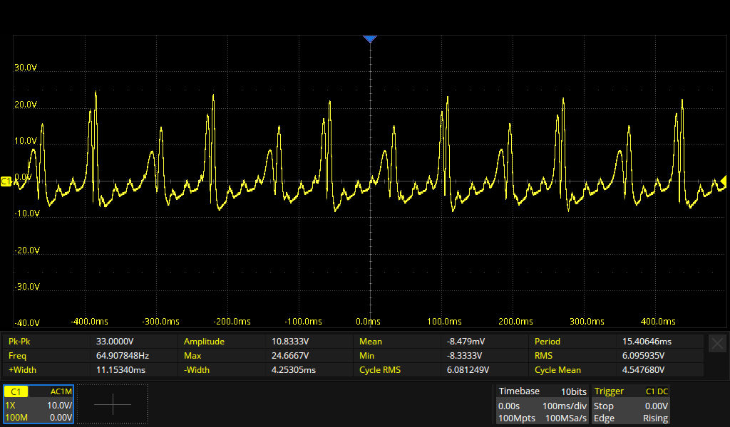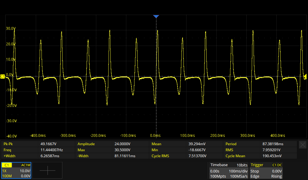 Snimak pokazuje napon iz induktora nakon što je ispravljen punovalnim diodnim ispravljačem (bez kondenzatora). Vršne vrijednosti napona su 33 Vpp (25 V pozitivni napon), a efektivna vrijednost istog je 6 V. Uočavaju se i dosta visoke negativne vrijednosti napona (-8,3 V) koje ne bi trebale biti veće od -0,8 V. Ipak, ovo je mehanički vrlo loše riješen generator gdje se teško kontrolira gibanje magneta i time nastale indukcije i samoindukcije. Puno stabilniji valni oblik daju generatori sa rotirajućim magnetom ili zavojnicama.