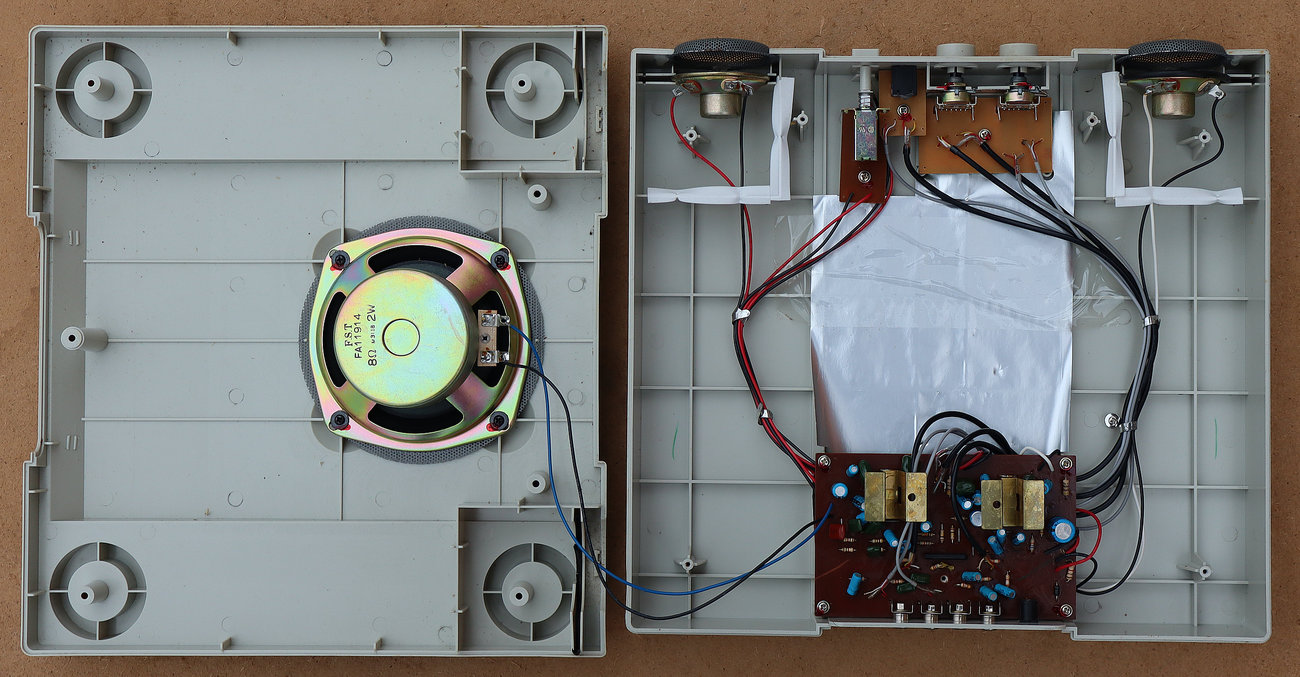 Stereo signali na izlazu iz aktivnog filtra dalje se vode na dva integrirana audio pojačala: jedno pojačalo je za lijevi i desni stereo kanal, a drugo pojačalo je samo za niske frekvencije (bass ili subwoffer pojačalo). U oba slučaja se kao pojačalo koristi integrirani krug TA8217P od kojih svaki sadrži po dva audio operacijska pojačala. Za stereo zvučnike se svaki kanal pojačava zasebno preko svojeg operacijskog pojačala, dok se za subwoffer koristi mosni spoj operacijskih pojačala.