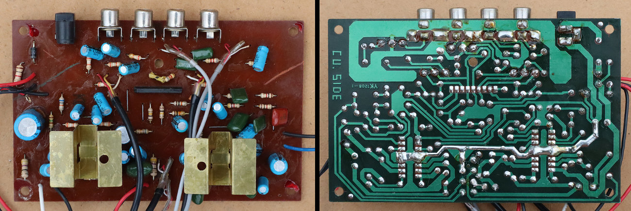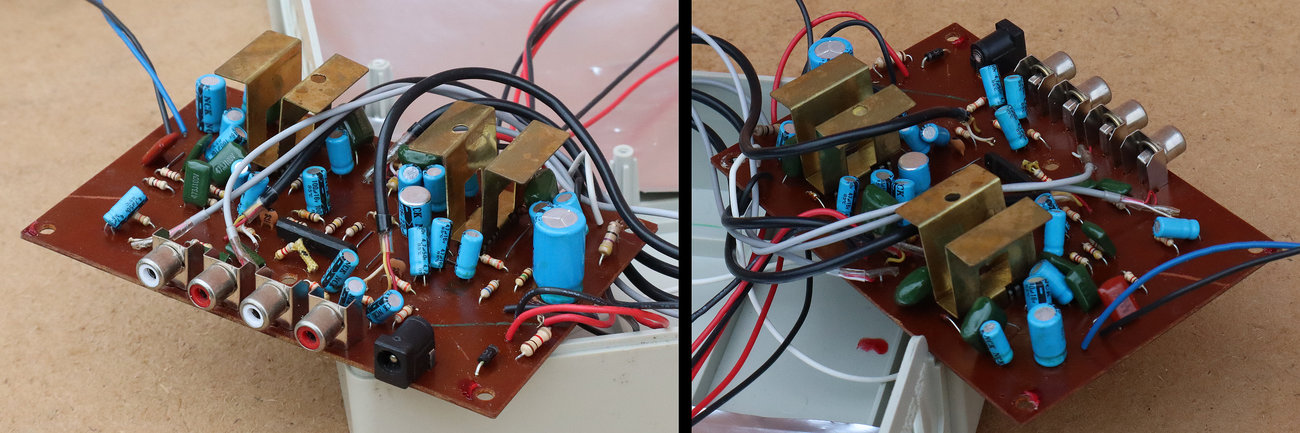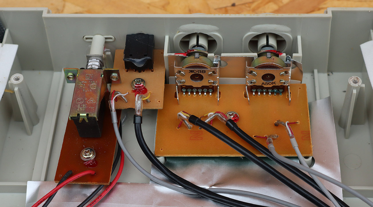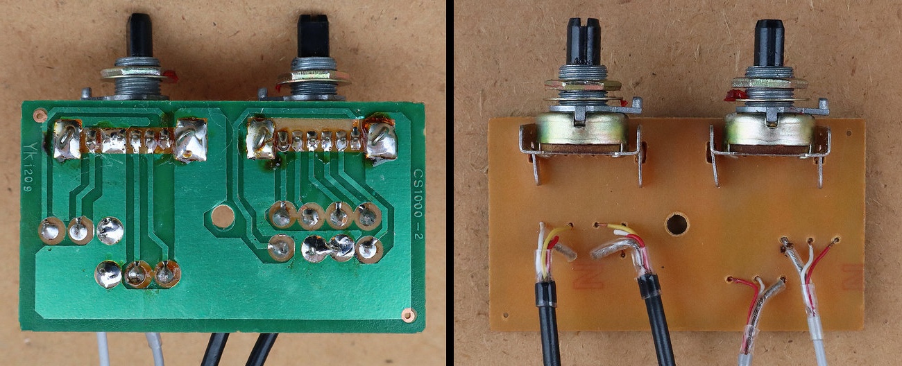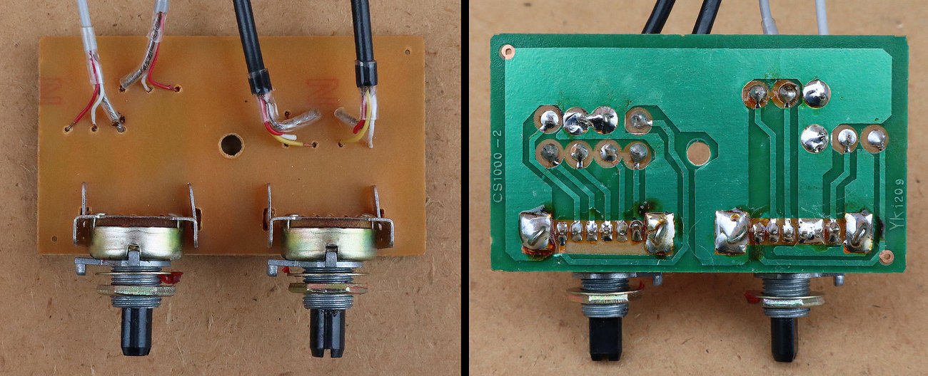 Potenciometri za jačinu zvuka i tonski filtar su dvostruki (stereo). Njihova izvedba može biti u obliku zasebnih potenciometara na zajedničkoj osovini, ili kao u našem slučaju, obje klizne trake sa klizačima su izvedene kao jedan element na jednoj zajedničkoj pločici. Ovakvi potenciometri normalno imaju šest izlaza, međutim oni nisu raspoređeni pravilno za jednu, a zatim za drugu sekciju potenciometra. Pinovi su malo izmiješani i raspoređeni ovako:
