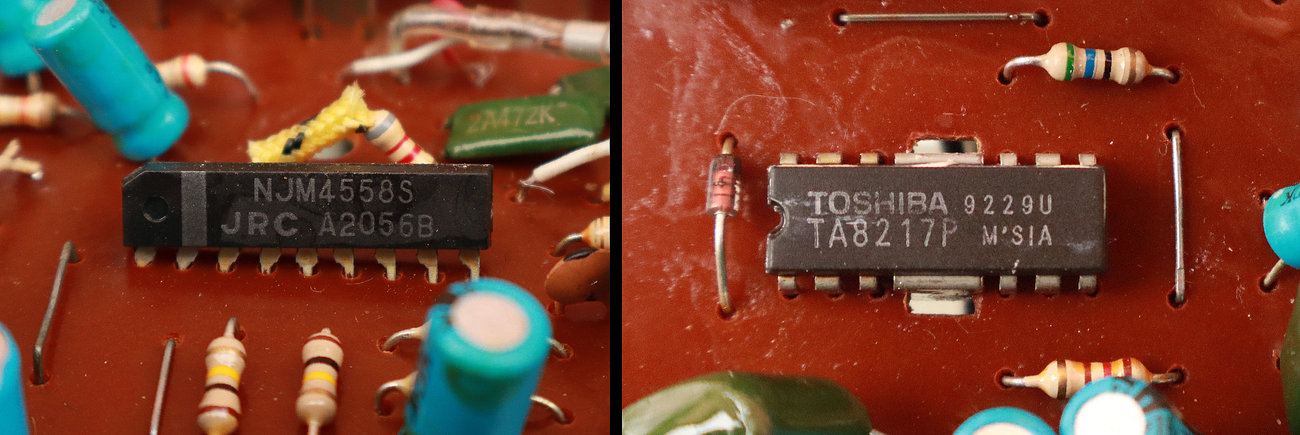 Stereo signali se dalje vode svaki na svoje audio operacijsko pojačalo unutar integriranog kruga NJM4558S. Operacijska pojačala su u neinvertirajućem spoju sa negativnom povratnom spregom preko djelitelja napona sa otpornikom 39 kΩ i potenciometrom 50 kΩ kojem je dodan RC filtar 8,2 kΩ / 4,7 nF. Tako se promjenom vrijednosti potenciometra 50 kΩ mijenja impedancija kruga povratne sprege ovisno o frekvenciji, čime se mijenja i pojačanje operacijskog pojačala za tu frekvenciju. Ovo je u osnovi jedna od izvedbi vrlo široko korištenih Baxandall tonskih filtara. Mali kondenzator od 22 pF spojen paralelno otporniku 39 kΩ u povratnoj sprezi služi za kompenzaciju internih parazitskih kapaciteta pojačala koji mogu uzrokovati pojavu VF šumova i pomaka faza u povratnoj sprezi, a posljedično tome i neželjene oscilacije pojačala (negativna povratna sprega se može fazno pomaknuti u pozitivnu povratnu spregu čime iz pojačala dobivamo oscilator).