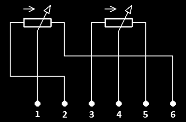 Raspored pinova dvostrukih potenciometara gledano sa strane tiskanih veza.