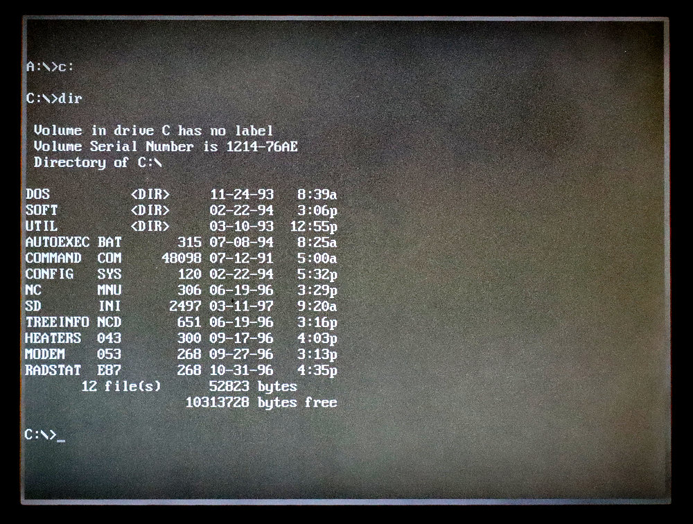 Preostao je pokušaj pokretanja računala preko DOS sistemske (bootable) diskete. Ovo je uspjelo i napokon sam mogao pristupiti tvrdom disku. Može se primijetiti kako je prepoznato nešto više od 10 MB kapaciteta diska, dok bi sam disk trebao biti kapaciteta 40 MB. Time nedostaje oko 30 MB diska.