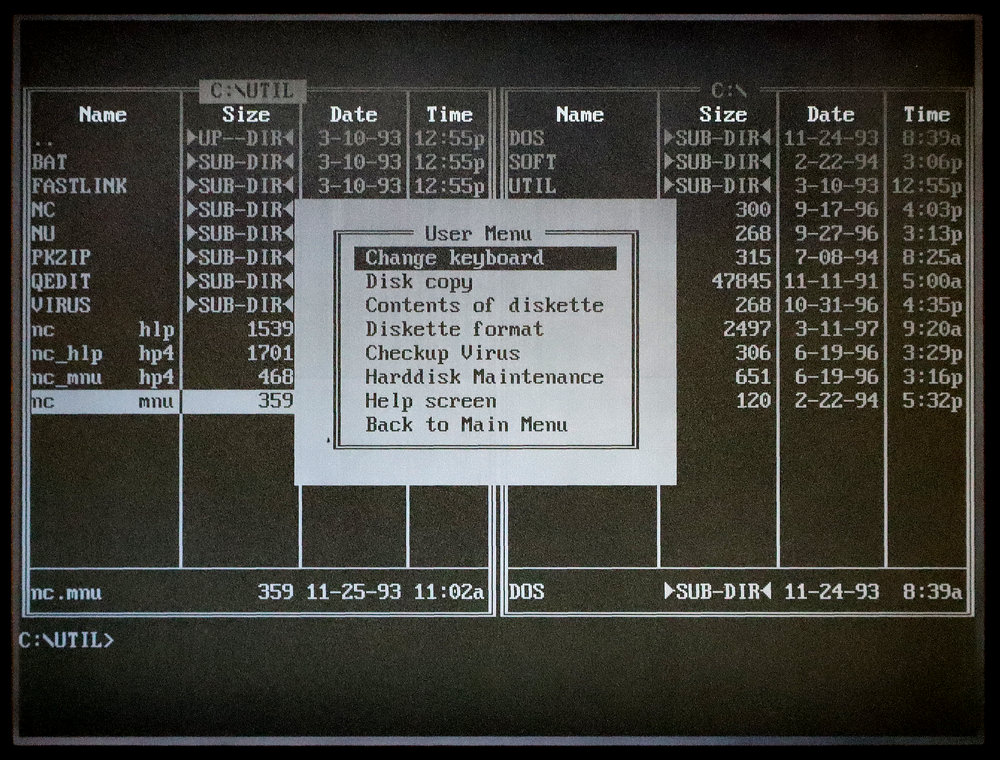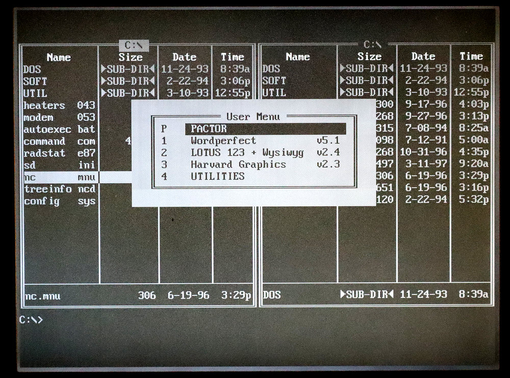 Pokretanjem autoexec.bat datoteke otvara se Norton Commander i dodatni izbornik sa klasičnim uredskim paketom s kraja 1980-ih i početka 1990-ih godina: