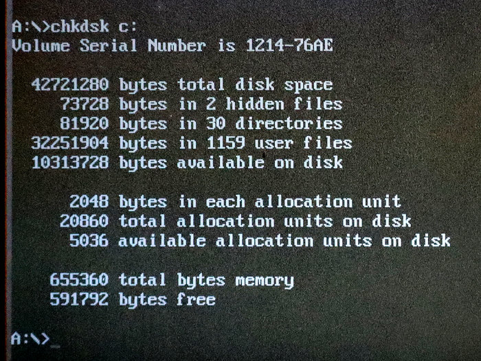 DOS naredba „chkdsk“ prepoznaje puni kapacitet diska od 40 MB od čega je oko 30 MB zauzeto, a oko 10 MB slobodno.