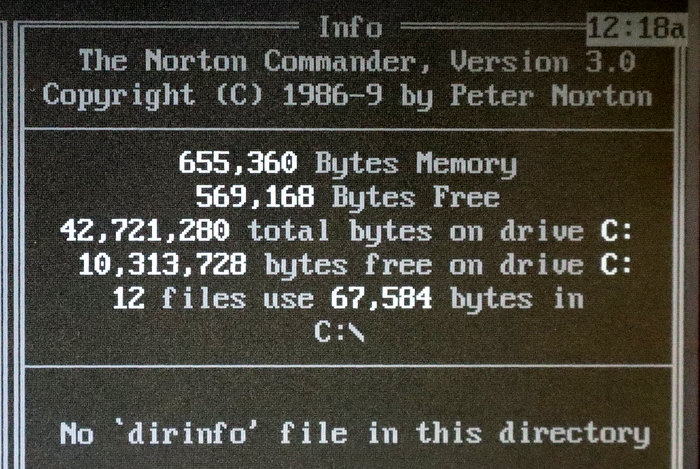 Norton Commander također prepoznaje puni kapacitet diska od 40 MB. Podatak o slobodnom prostoru (oko 10 MB) je uvijek dostupan, međutim podatak o zauzeću uključuje samo otvorene datoteke, dok se one u mapama ovdje ne zbrajaju jer bi to zahtijevalo puno rada HDD-a i CPU-a.