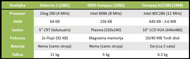 Compaq SLT/286 procesor 286 na 12 MHz bio je oko 5-10 puta brži od procesora u Osborneu. Mogao je pokretati rani multitasking, dok su prvi modeli bili strogo ograničeni na jedan jednostavan program (poput WordStara). Osborne je mogao prikazati samo tekst na minijaturnom ekranu. GRiD je imao naprednu plasmu, ali Compaq je donio VGA standard. To znači da ste na njemu mogao pokretati pravi grafički softver (Windows, AutoCAD) koji izgleda gotovo kao na stolnom monitoru. Na Osborneu su se morale stalno mijenjati diskete da bi se učitao program ili spremio dokument. Compaqov tvrdi disk od 40 MB mogao je pohraniti tisuće dokumenata i desetke programa odjednom. Iako je GRiD bio nešto lakši, nije imao bateriju. Compaq SLT/286 je bio prvi stroj koji ste mogli otvoriti u vlaku ili avionu i zapravo raditi bez utičnice.