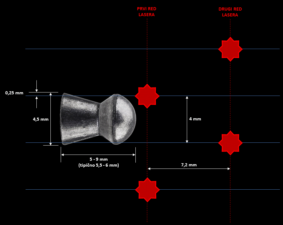 Kalibar od 4,5 mm ulazi u dvije susjedne laserske zrake sa rubnim širinama od svega 0,25 mm. Također, laseri ne mogu biti baš 100% paralelno poravnati, a i širina (fokus) same laserske zrake se može razlikovati. Stoga smo testove napravili na četiri kanala kako bi rezultat bio pouzdaniji. Testovi su rađeni na slijedećim podešenim pragovima logičkih jedinica: